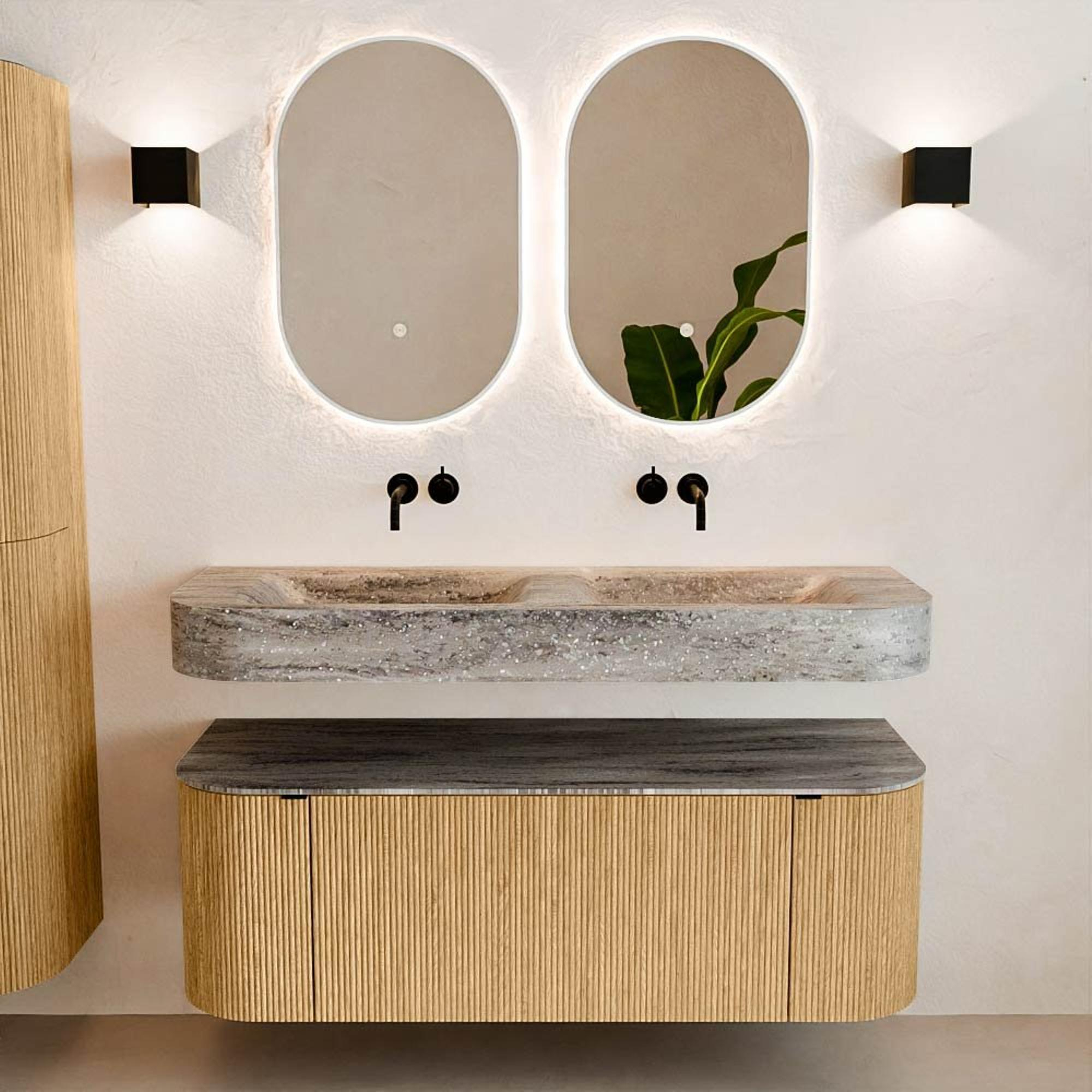 Matériaux naturels dans des tons chauds. Les cannelures verticales apportent rythme et texture au design, tandis que le chêne confère une apparence chaleureuse et artisanale. Choisissez parmi 5 teintes de bois OAK, WALNUT, DUSK, SHADOW et RUBY, des couleurs de bois soigneusement sélectionnées pour enrichir les salles de bains modernes et classiques.