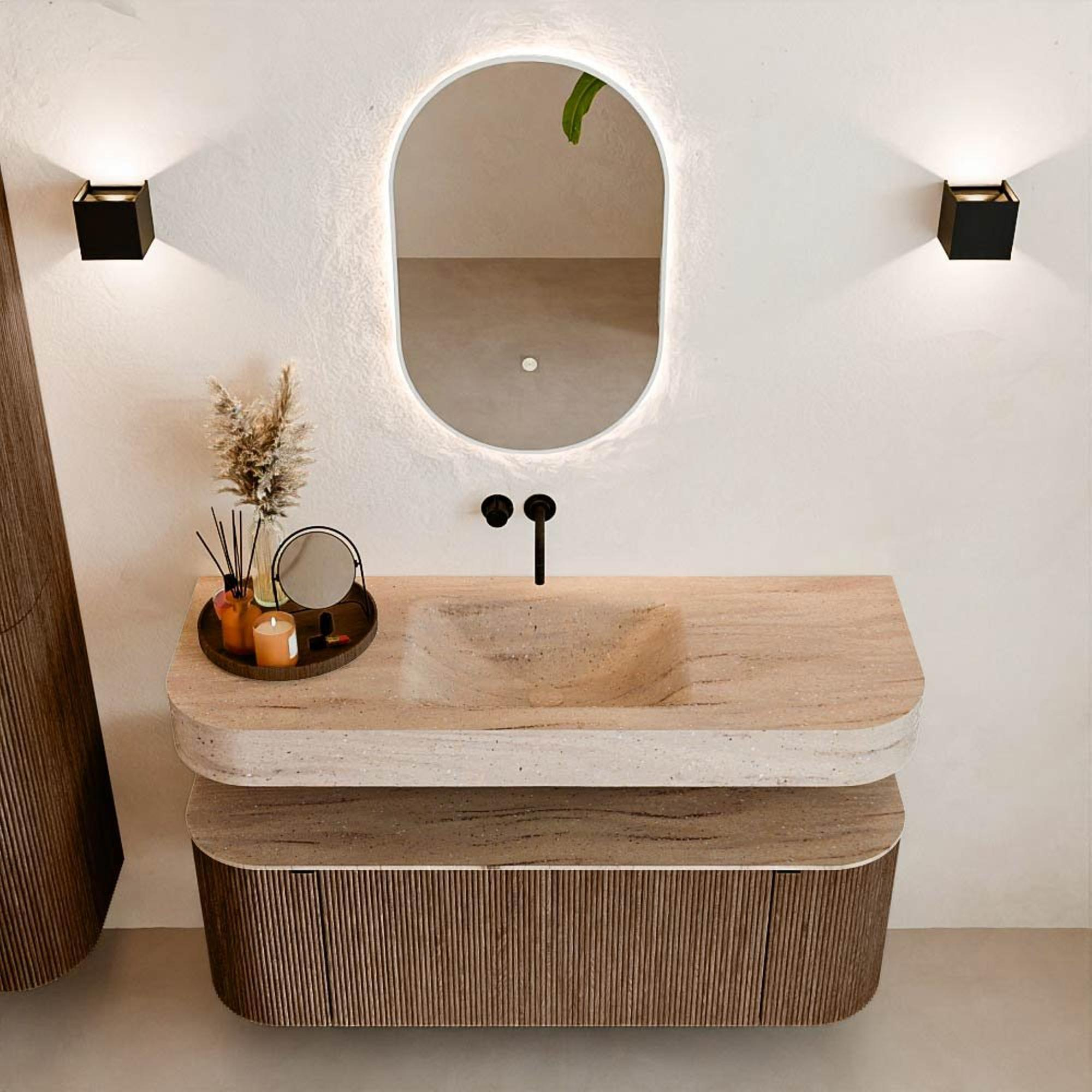 Au-dessus du meuble flotte une vasque suspendue assortie aux coins arrondis – parfaitement adaptée à la forme du meuble. La vasque est en Solid Surface et suit subtilement les lignes du meuble inférieur, créant un ensemble harmonieux. Le plan de travail en Solid Surface constitue une base solide et facile d'entretien, complétant la combinaison.