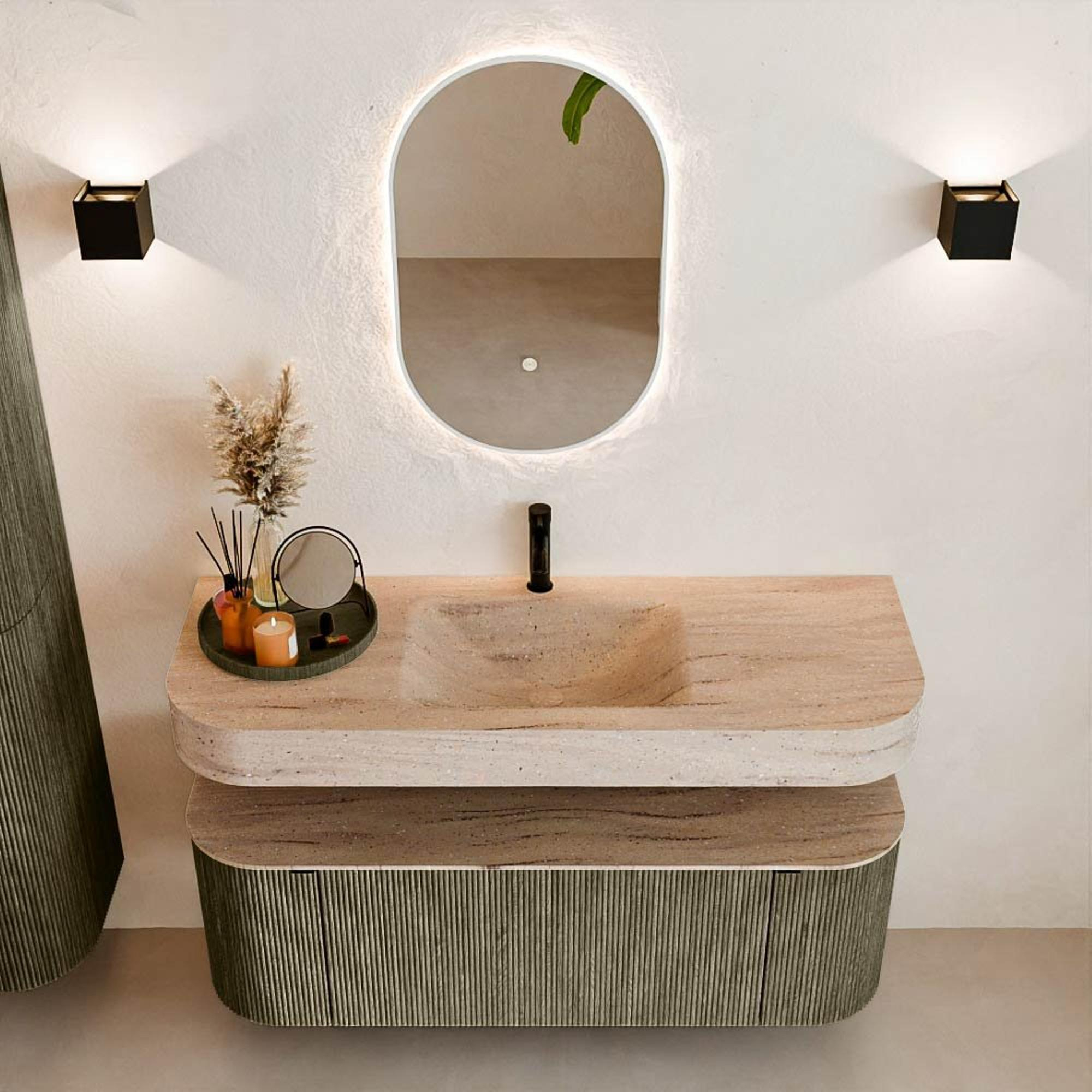 Matériaux naturels dans des tons chauds. Les rainures verticales apportent rythme et texture au design, tandis que le chêne confère une apparence chaleureuse et artisanale. Choisissez parmi 5 teintes de bois OAK, WALNUT, DUSK, SHADOW et RUBY, des couleurs de bois soigneusement sélectionnées pour enrichir les salles de bains modernes et classiques.