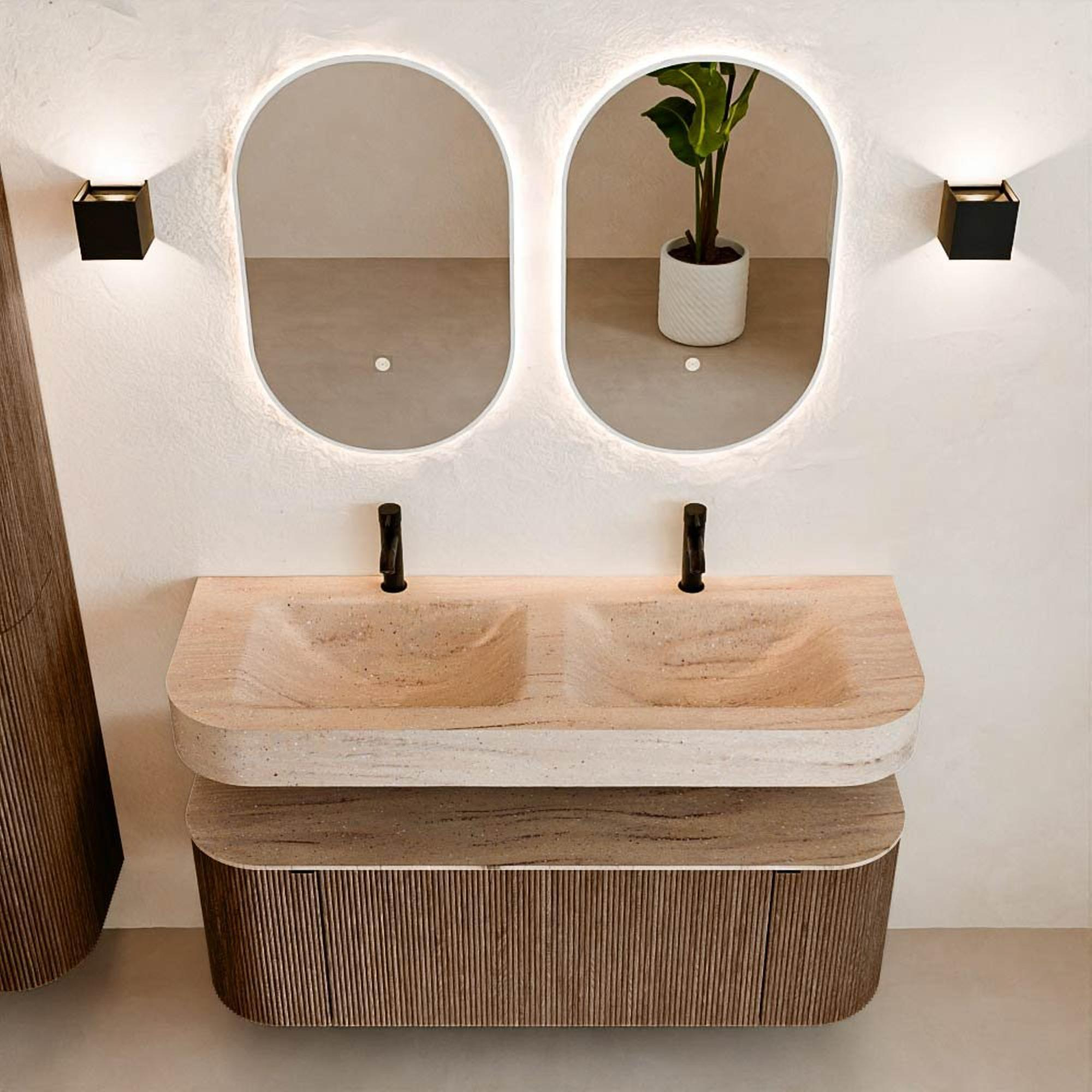 Matériaux naturels dans des tons chauds. Les nervures verticales apportent rythme et texture au design, tandis que le chêne assure une apparence chaleureuse et artisanale. Choisissez parmi 5 teintes de bois OAK, WALNUT, DUSK, SHADOW et RUBY, des couleurs de bois soigneusement sélectionnées pour enrichir les salles de bains modernes et classiques.