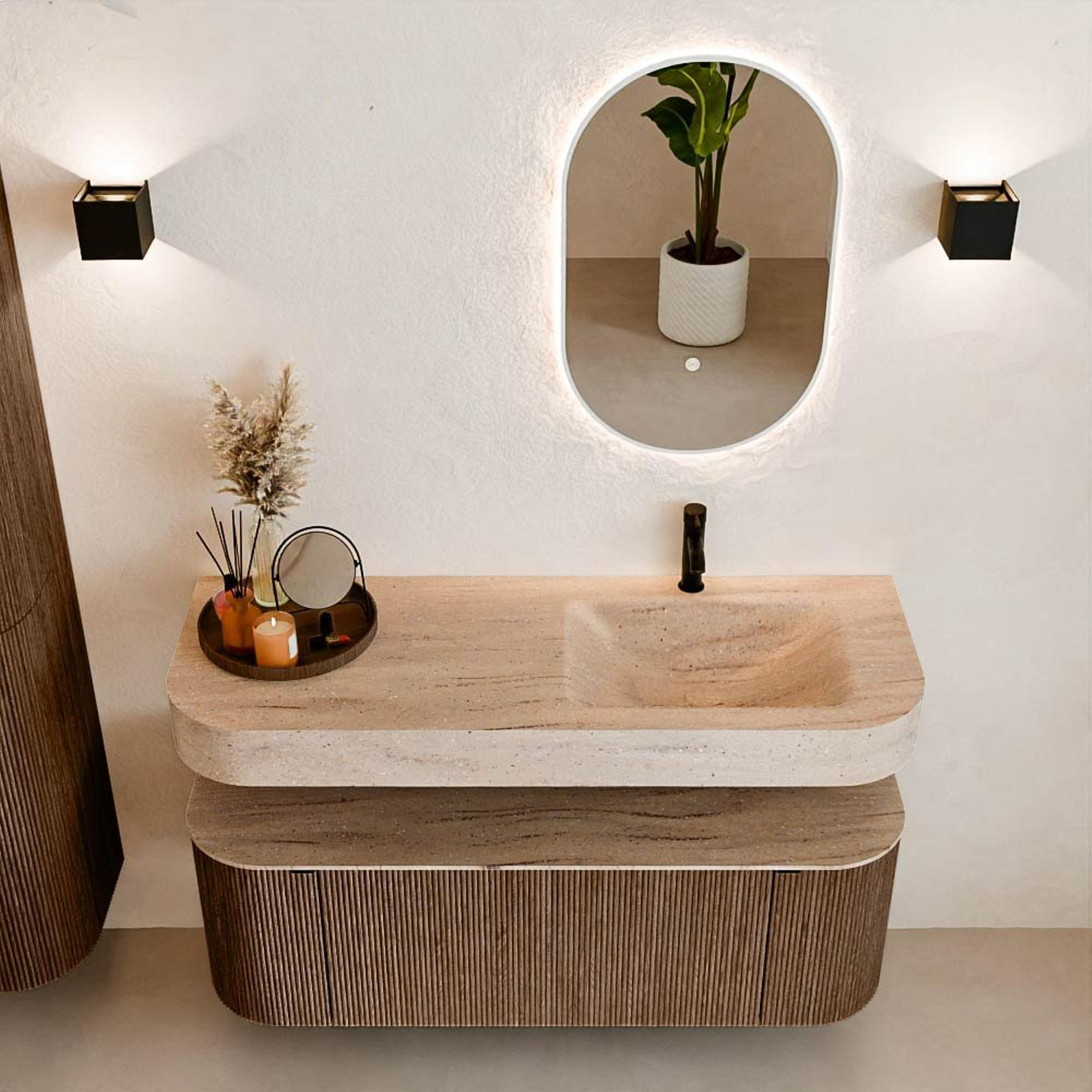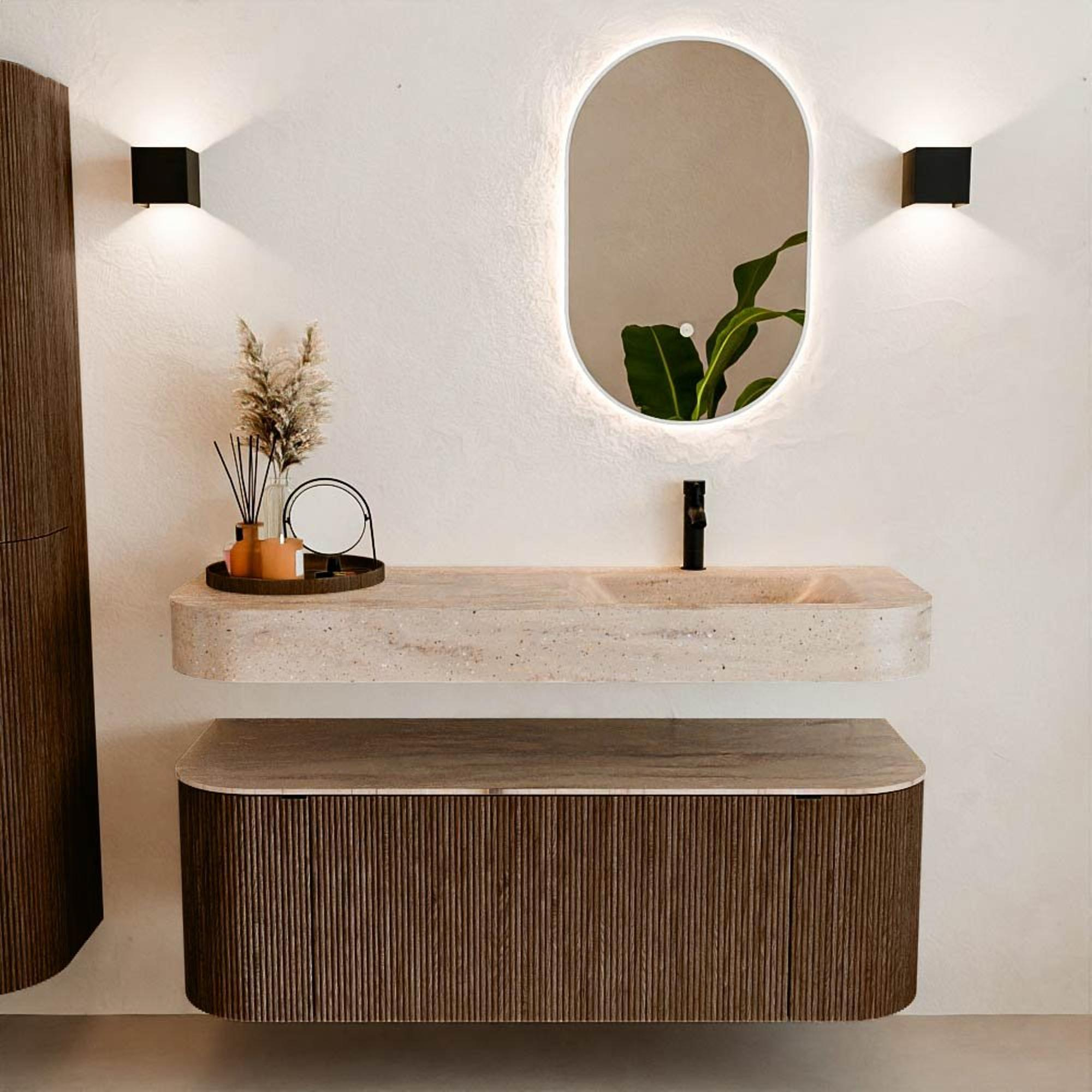 Matériaux naturels dans des tons chauds. Les nervures verticales apportent rythme et texture au design, tandis que le chêne confère une apparence chaleureuse et artisanale. Choisissez parmi 5 teintes de bois OAK, WALNUT, DUSK, SHADOW et RUBY, des couleurs de bois soigneusement sélectionnées pour enrichir les salles de bains modernes et classiques.