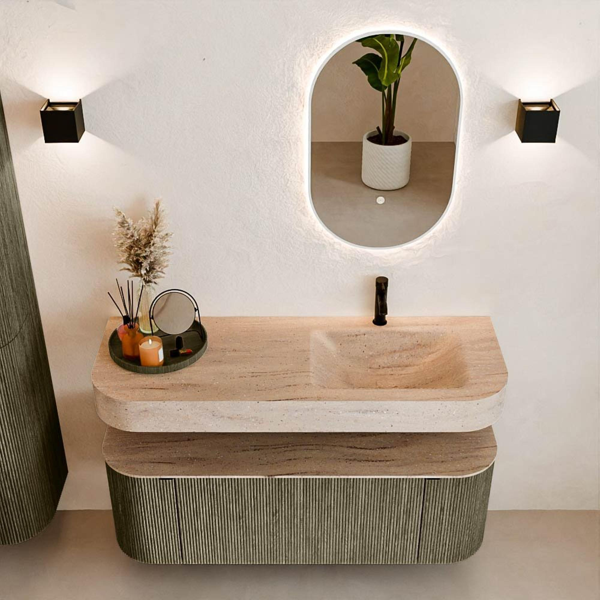 Matériaux naturels dans des tons chauds. Les nervures verticales apportent rythme et texture au design, tandis que le chêne confère une apparence chaleureuse et artisanale. Choisissez parmi 5 teintes de bois OAK, WALNUT, DUSK, SHADOW et RUBY, des couleurs de bois soigneusement sélectionnées pour enrichir les salles de bains modernes et classiques.