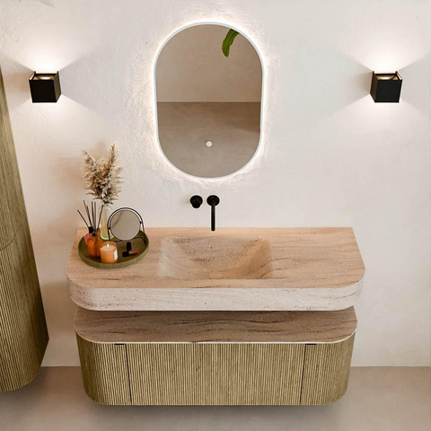 Matériaux naturels dans des tons chauds. Les nervures verticales apportent rythme et texture au design, tandis que le chêne confère une apparence chaleureuse et artisanale. Choisissez parmi 5 teintes de bois OAK, WALNUT, DUSK, SHADOW et RUBY, des couleurs de bois soigneusement sélectionnées pour enrichir les salles de bains modernes et classiques.