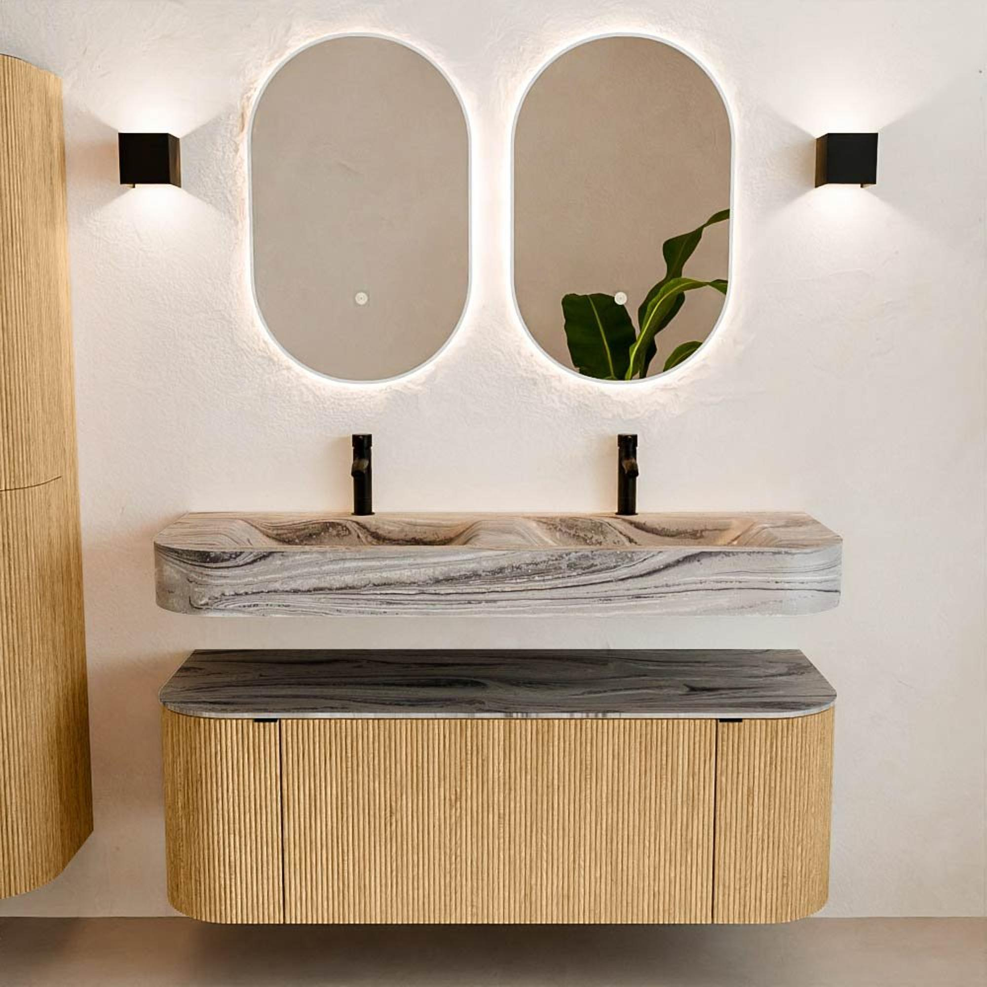 Matériaux naturels dans des tons chauds. Les rainures verticales apportent rythme et texture au design, tandis que le chêne confère une apparence chaleureuse et artisanale. Choisissez parmi 5 teintes de bois OAK, WALNUT, DUSK, SHADOW et RUBY, des couleurs de bois soigneusement sélectionnées pour enrichir les salles de bains modernes et classiques.
