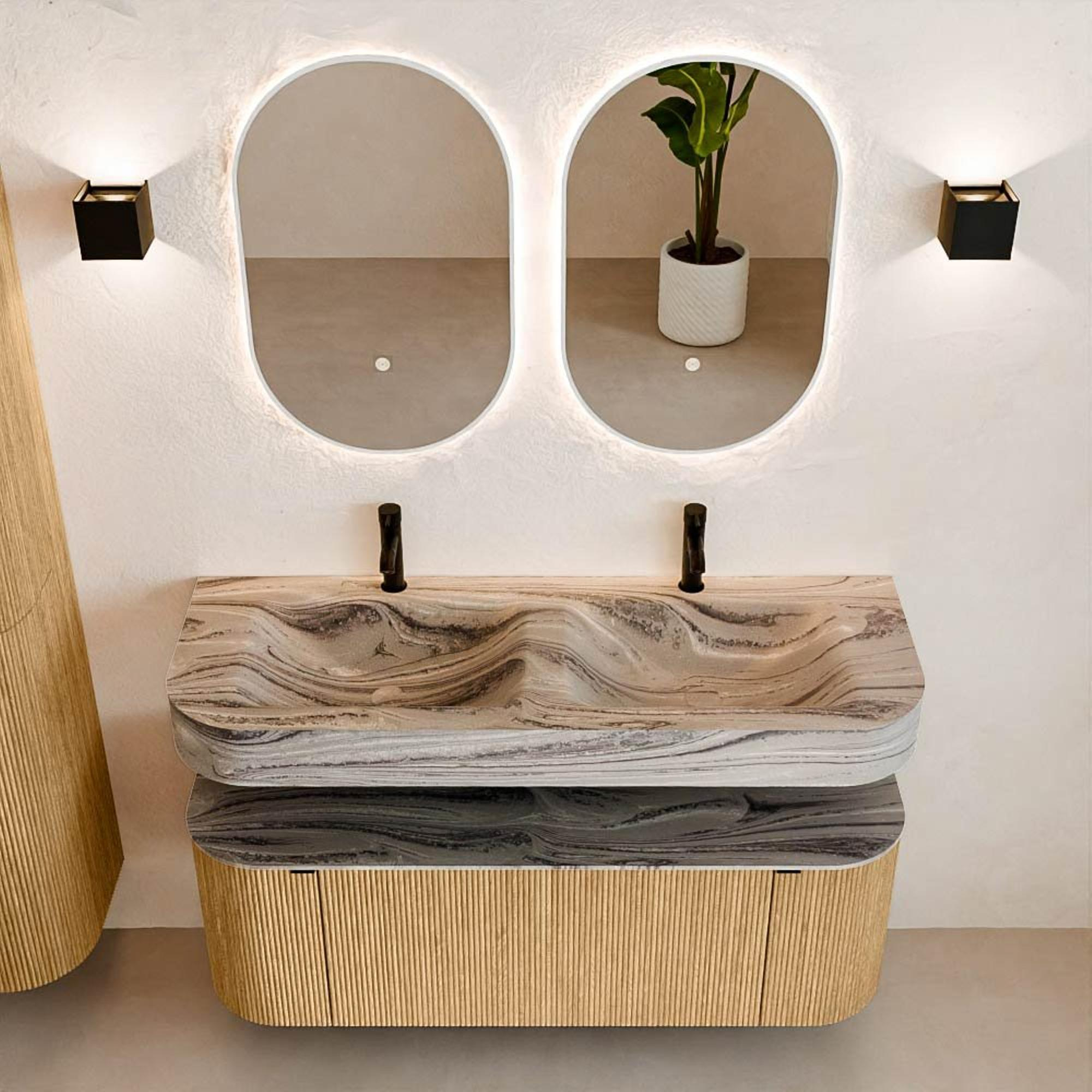MONDIAZ THOR-DLUX 130cm meuble de salle de bains arrondi gauche + droite couleur Oak avec 1 tiroir et 2 portes. Vasque suspendue CLOUD Double 2 trous de robinet couleur Sombra.