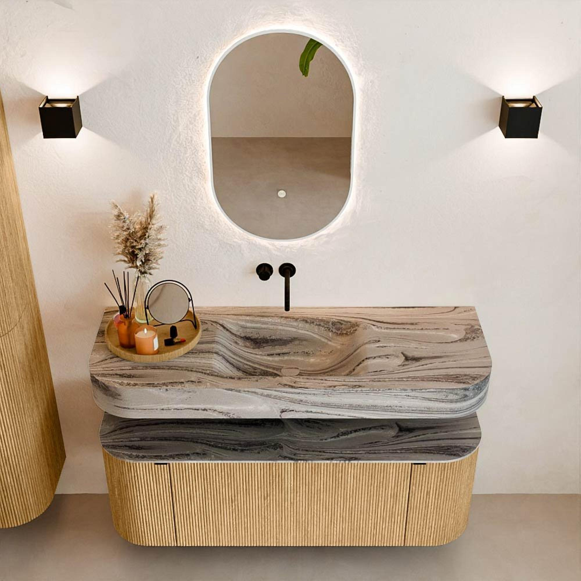Matériaux naturels dans des tons chauds. Les rainures verticales apportent rythme et texture au design, tandis que le chêne confère une apparence chaleureuse et artisanale. Choisissez parmi 5 teintes de bois OAK, WALNUT, DUSK, SHADOW et RUBY, des couleurs de bois soigneusement sélectionnées pour enrichir les salles de bains modernes et classiques.