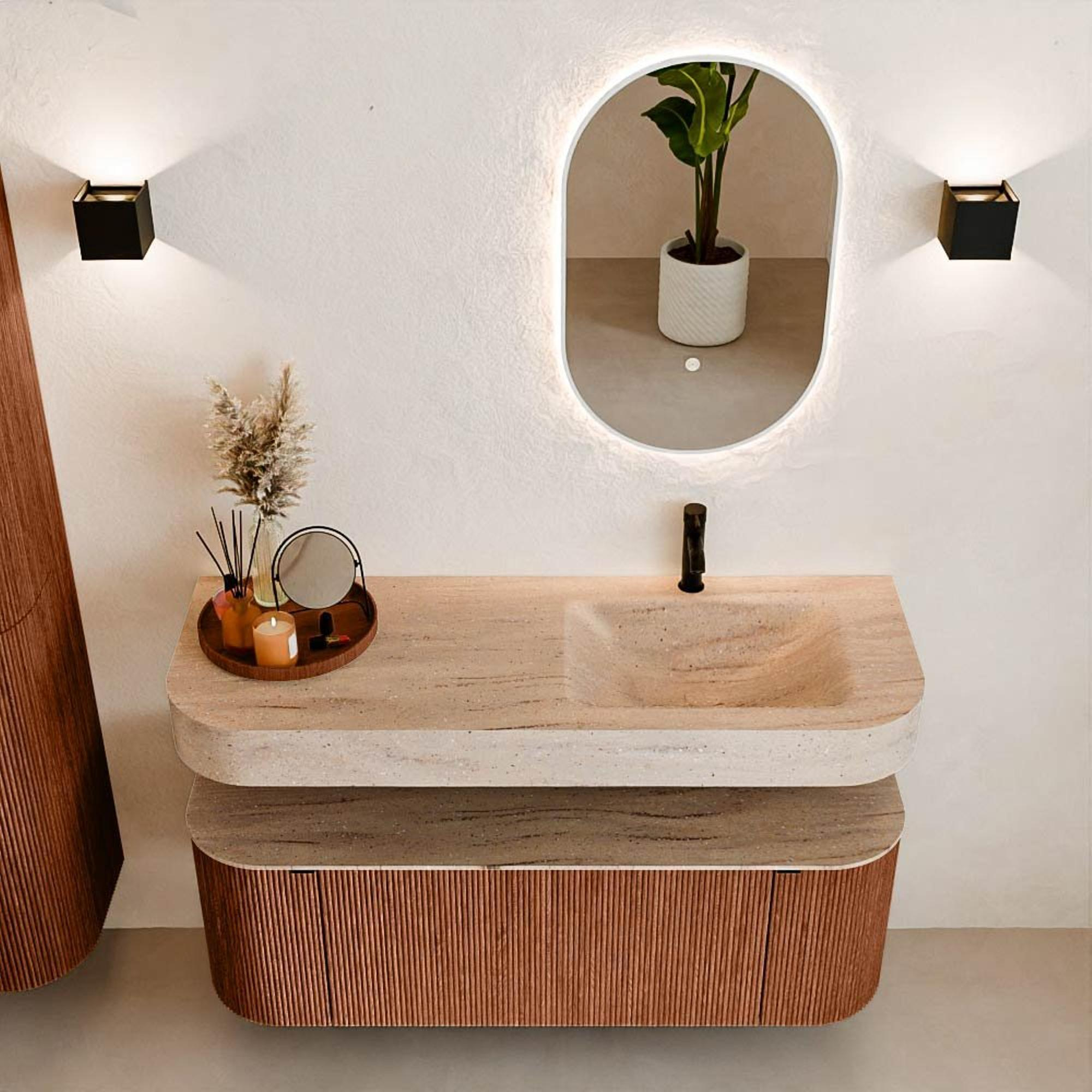 Matériaux naturels dans des tons chauds. Les rainures verticales apportent rythme et texture au design, tandis que le chêne confère une apparence chaleureuse et artisanale. Choisissez parmi 5 teintes de bois OAK, WALNUT, DUSK, SHADOW et RUBY, des couleurs de bois soigneusement sélectionnées pour enrichir les salles de bains modernes et classiques.