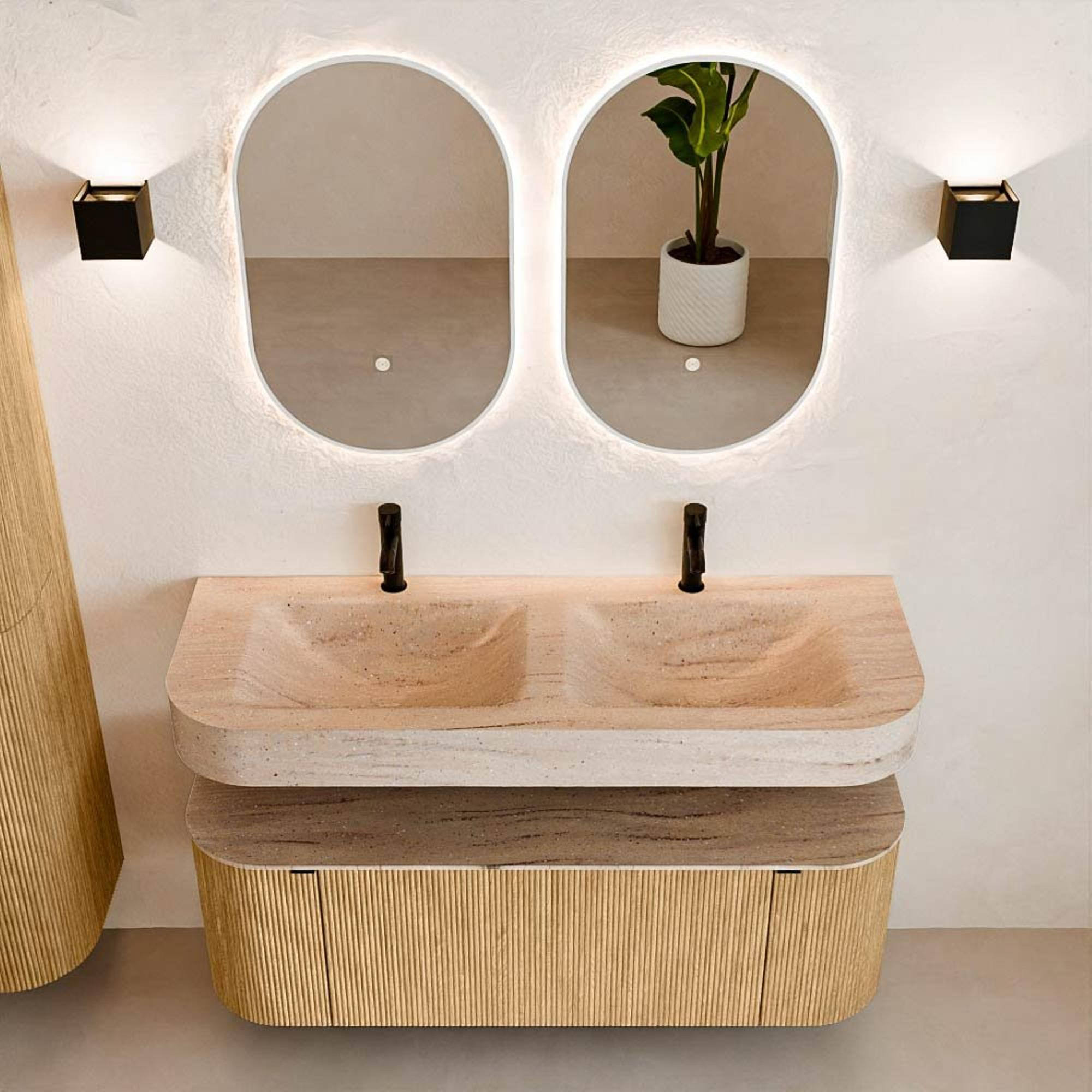 MONDIAZ THOR-DLUX 130cm meuble de salle de bains arrondi gauche + droite couleur Oak avec 1 tiroir et 2 portes. Vasque suspendue CLOUD Double 2 trous de robinet couleur Saba.