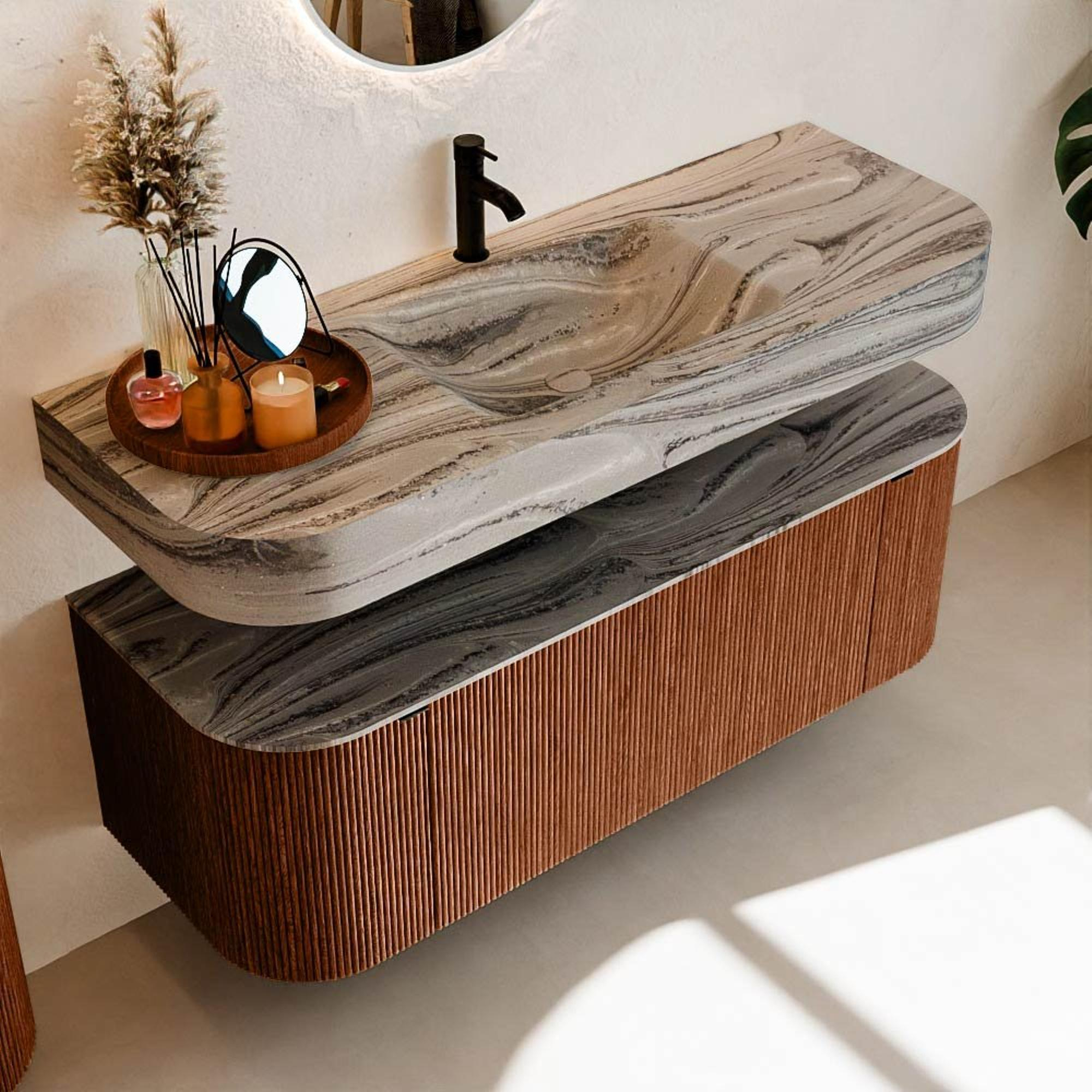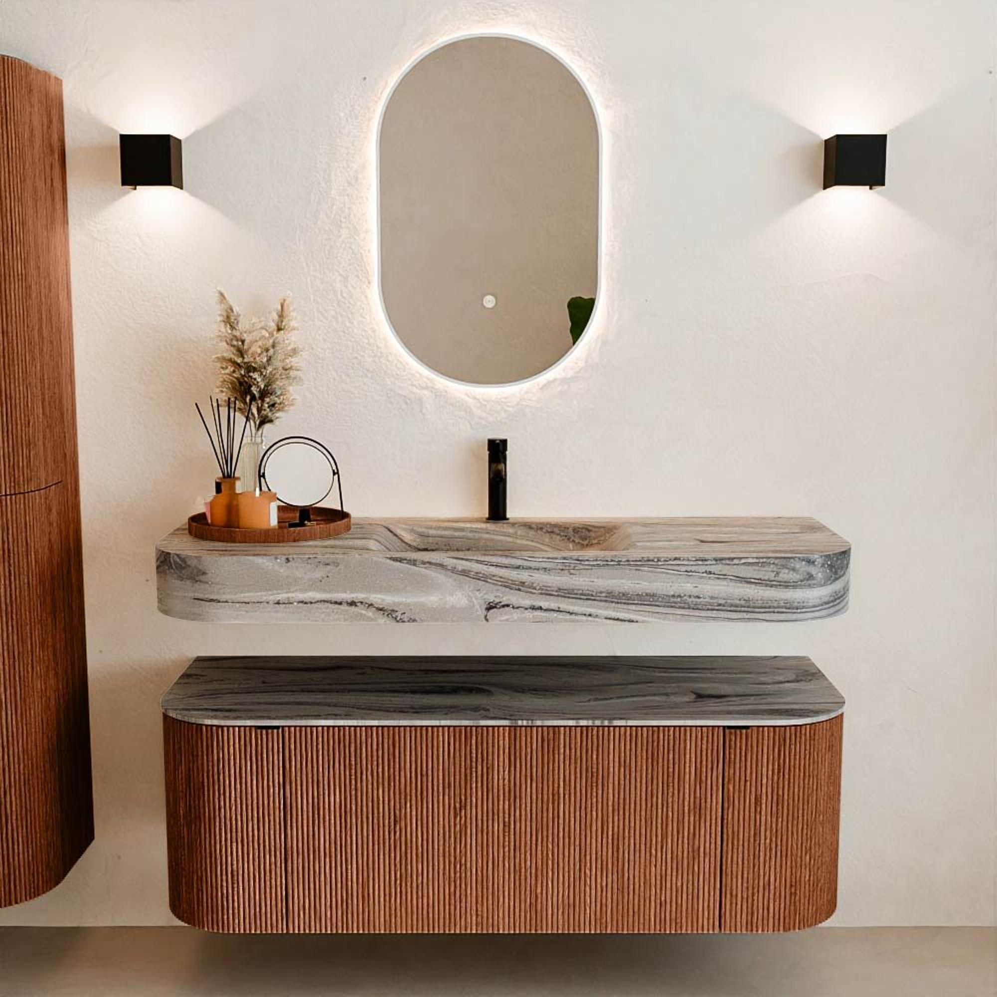 Matériaux naturels dans des tons chauds. Les nervures verticales apportent rythme et texture au design, tandis que le chêne confère une apparence chaleureuse et artisanale. Choisissez parmi 5 teintes de bois OAK, WALNUT, DUSK, SHADOW et RUBY, des couleurs de bois soigneusement sélectionnées pour enrichir les salles de bains modernes et classiques.