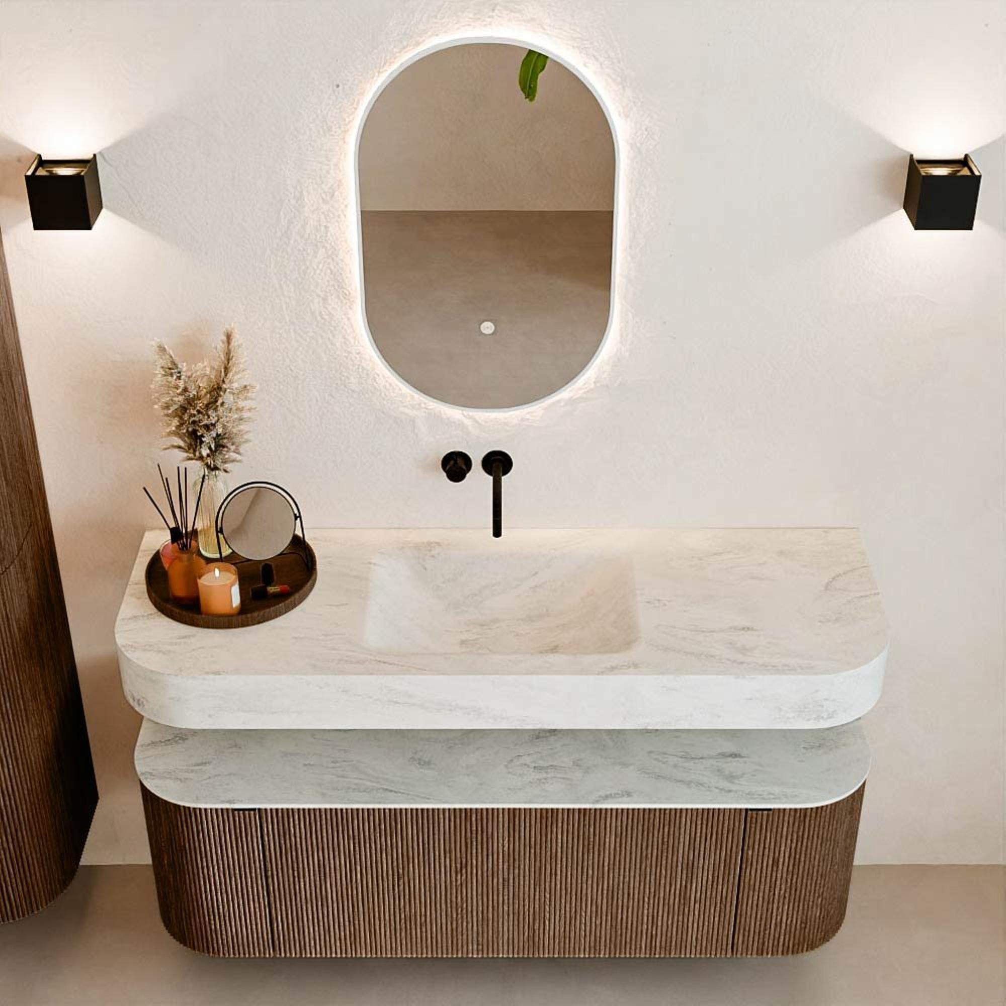 Matériaux naturels dans des tons chauds. Les nervures verticales apportent rythme et texture au design, tandis que le chêne confère une apparence chaleureuse et artisanale. Choisissez parmi 5 teintes de bois OAK, WALNUT, DUSK, SHADOW et RUBY, des couleurs de bois soigneusement sélectionnées pour enrichir les salles de bains modernes et classiques.