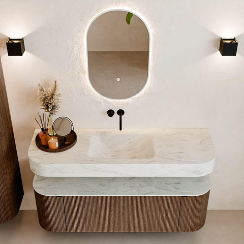 MONDIAZ THOR-DLUX Meuble de salle de bains 140cm arrondi gauche + droite couleur Walnut avec 1 tiroir et 2 portes. Vasque suspendue CLOUD Centre sans trou de robinet couleur Opalo.