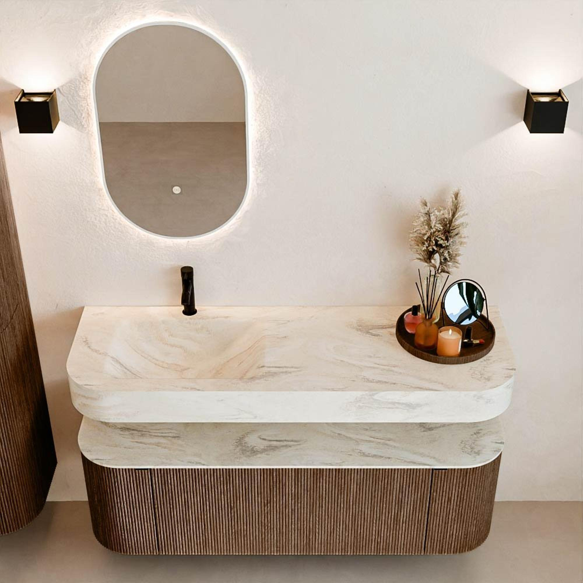 Matériaux naturels dans des tons chauds. Les nervures verticales apportent rythme et texture au design, tandis que le chêne confère une apparence chaleureuse et artisanale. Choisissez parmi 5 teintes de bois OAK, WALNUT, DUSK, SHADOW et RUBY, des couleurs de bois soigneusement sélectionnées pour enrichir les salles de bains modernes et classiques.