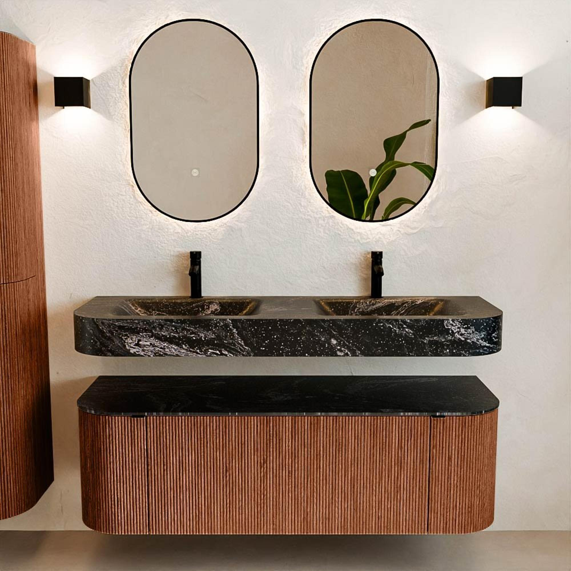 Matériaux naturels dans des tons chauds. Les nervures verticales apportent rythme et texture au design, tandis que le chêne confère une apparence chaleureuse et artisanale. Choisissez parmi 5 teintes de bois OAK, WALNUT, DUSK, SHADOW et RUBY, des couleurs de bois soigneusement sélectionnées pour enrichir les salles de bains modernes et classiques.