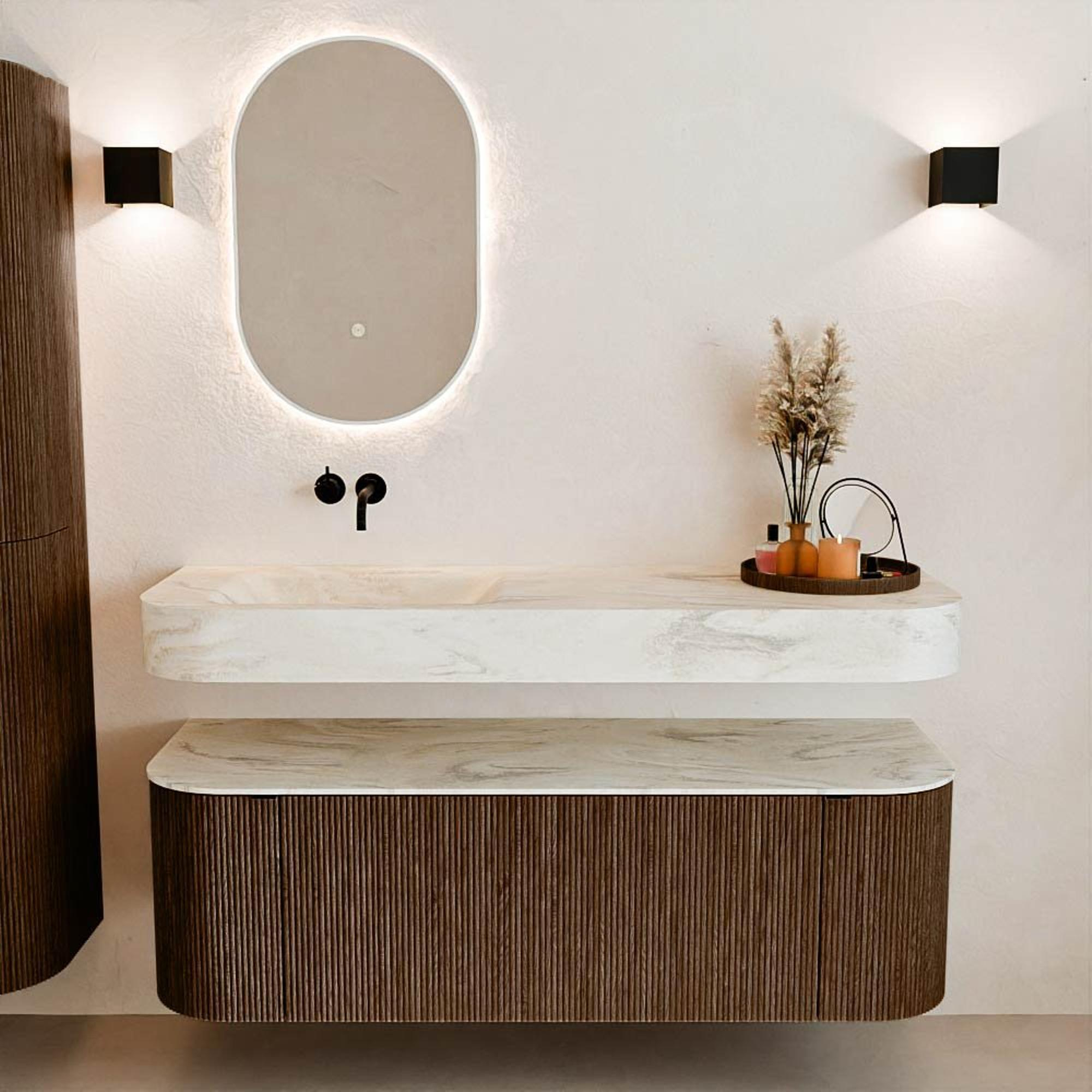 Matériaux naturels dans des tons chauds. Les reliefs verticaux apportent rythme et texture au design, tandis que le chêne confère une apparence chaleureuse et artisanale. Choisissez parmi 5 teintes de bois OAK, WALNUT, DUSK, SHADOW et RUBY, des couleurs de bois soigneusement sélectionnées pour enrichir les salles de bains modernes et classiques.