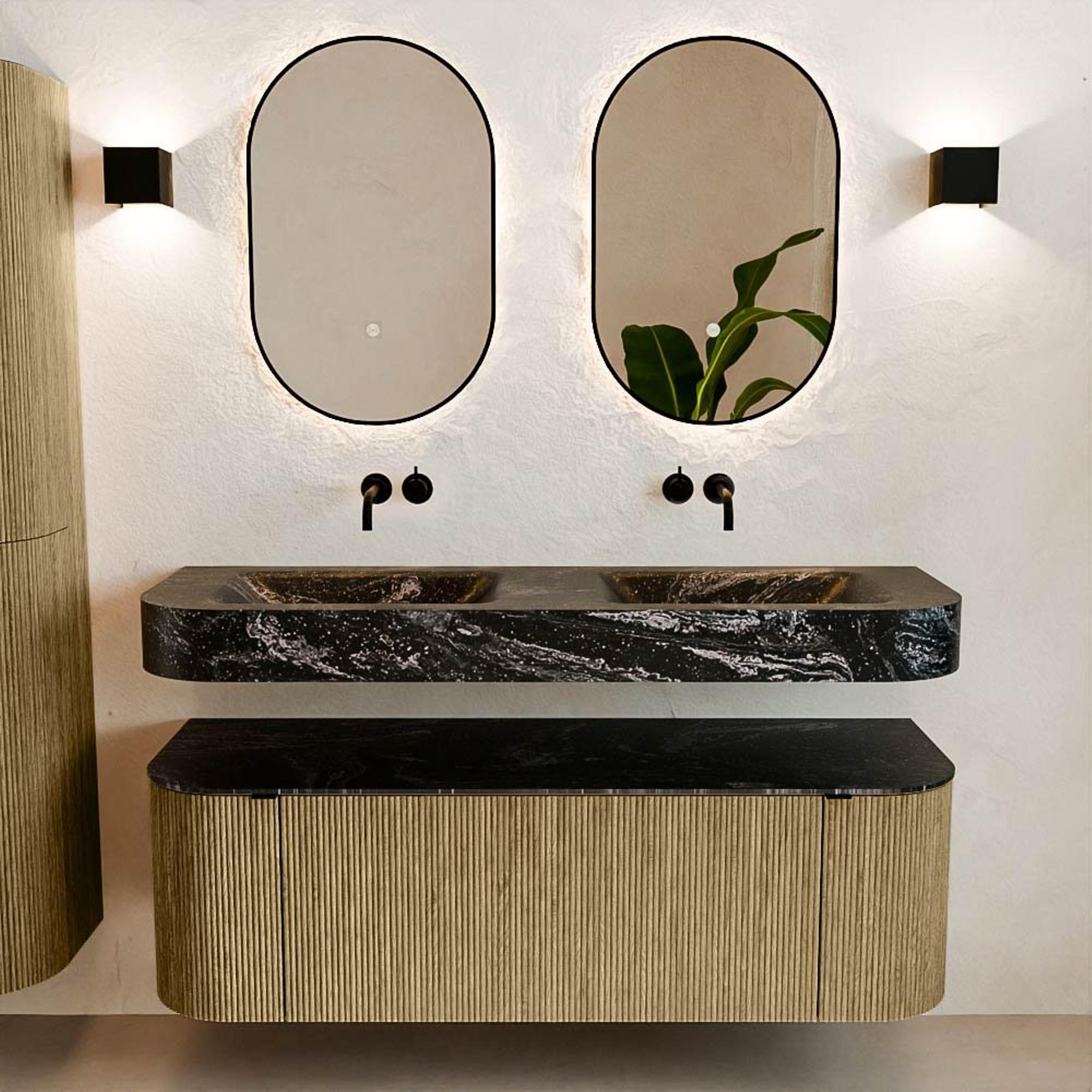 Matériaux naturels dans des tons chauds. Les reliefs verticaux apportent rythme et texture au design, tandis que le chêne confère une apparence chaleureuse et artisanale. Choisissez parmi 5 teintes de bois OAK, WALNUT, DUSK, SHADOW et RUBY, des couleurs de bois soigneusement sélectionnées pour enrichir les salles de bains modernes et classiques.