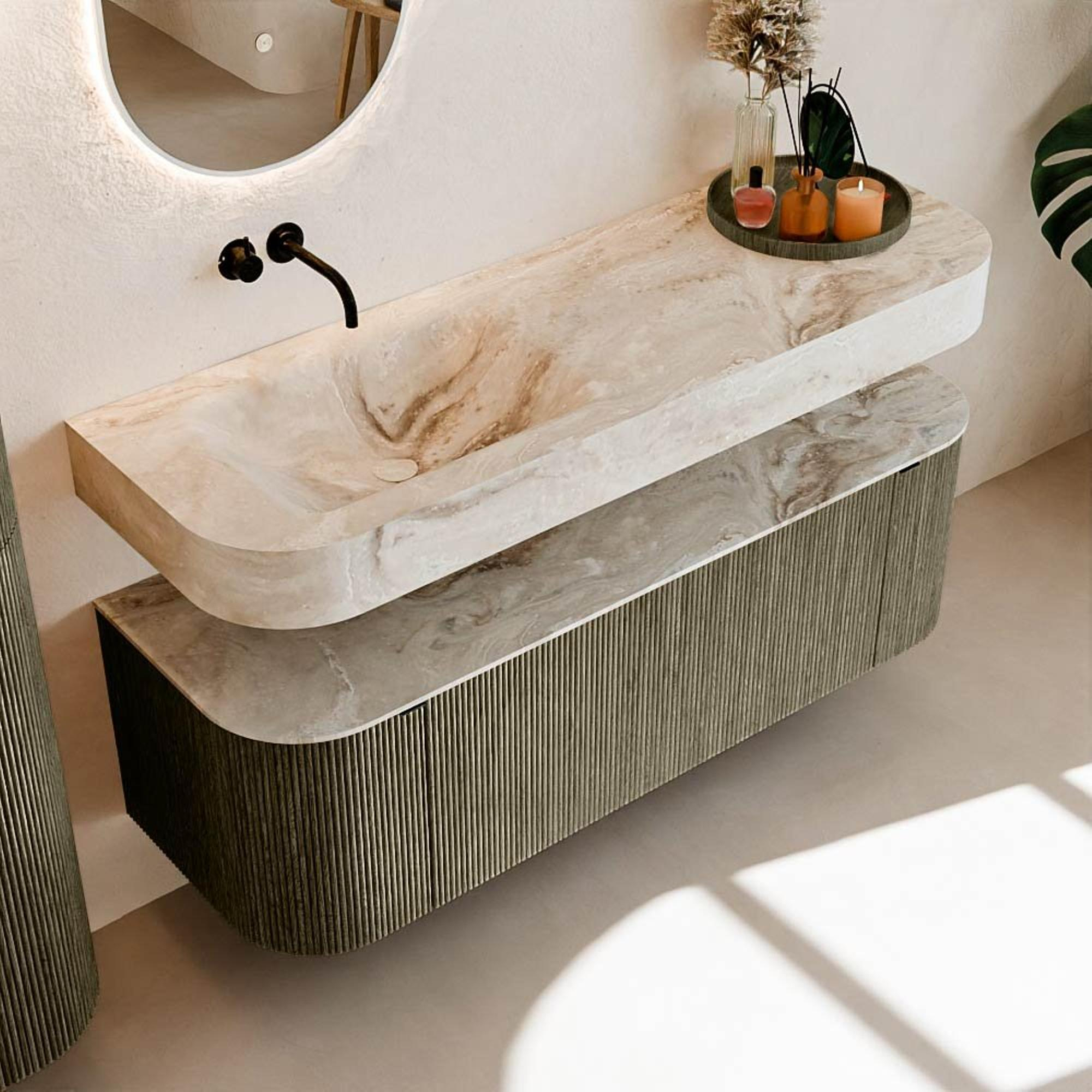 Au-dessus du meuble flotte une vasque suspendue assortie aux coins arrondis – parfaitement adaptée à la forme du meuble. La vasque est réalisée en Solid Surface et suit subtilement les lignes du meuble inférieur, créant ainsi un ensemble harmonieux. Le plateau en Solid Surface constitue une base solide et facile d'entretien et complète la combinaison.