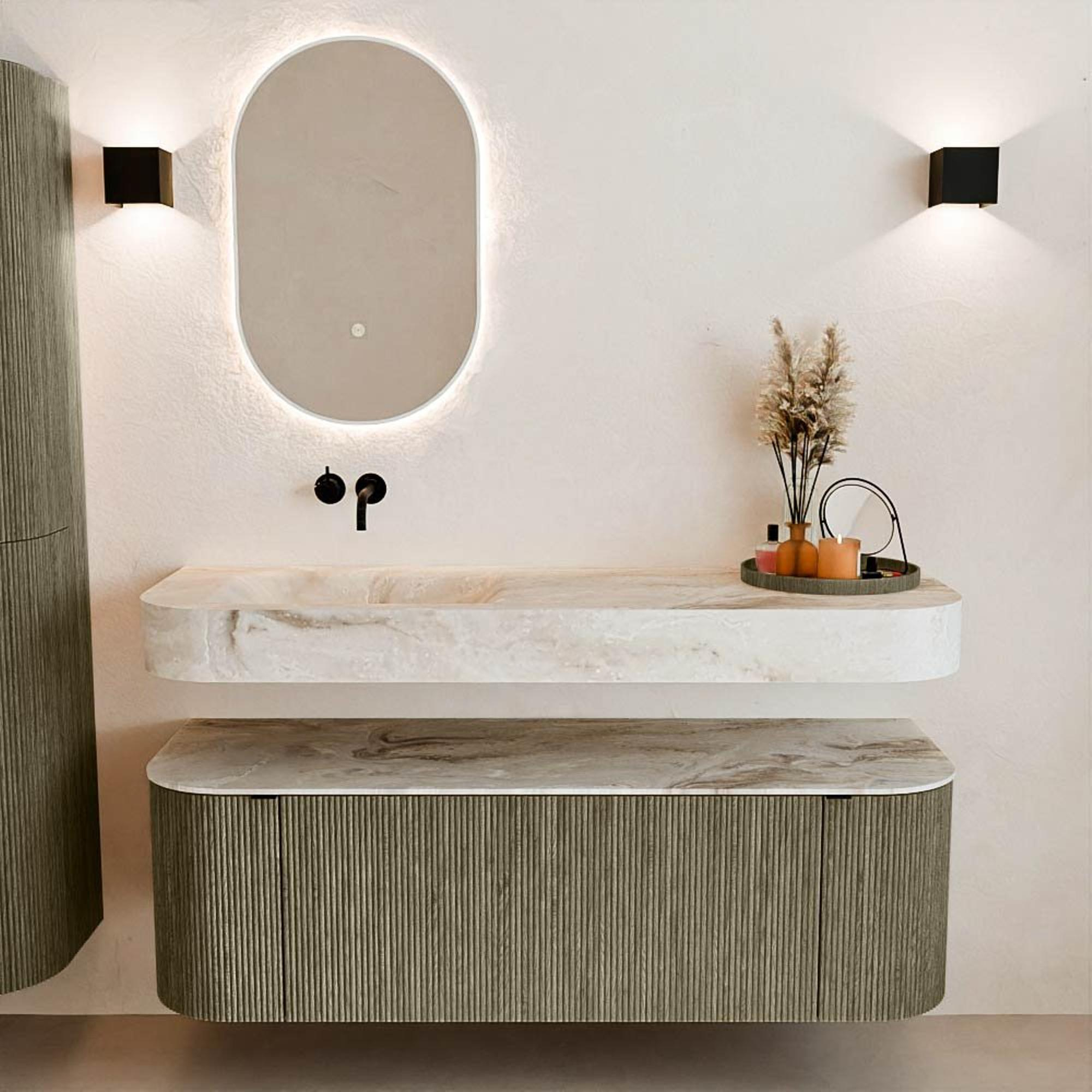 Matériaux naturels dans des tons chauds. Les nervures verticales apportent rythme et texture au design, tandis que le chêne confère une apparence chaleureuse et artisanale. Choisissez parmi 5 teintes de bois OAK, WALNUT, DUSK, SHADOW et RUBY, des couleurs de bois soigneusement sélectionnées pour enrichir les salles de bains modernes et classiques.