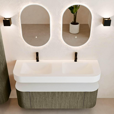 Matériaux naturels dans des tons chauds. Les nervures verticales apportent rythme et texture au design, tandis que le chêne confère une apparence chaleureuse et artisanale. Choisissez parmi 5 teintes de bois OAK, WALNUT, DUSK, SHADOW et RUBY, des couleurs de bois soigneusement sélectionnées pour enrichir les salles de bains modernes et classiques.