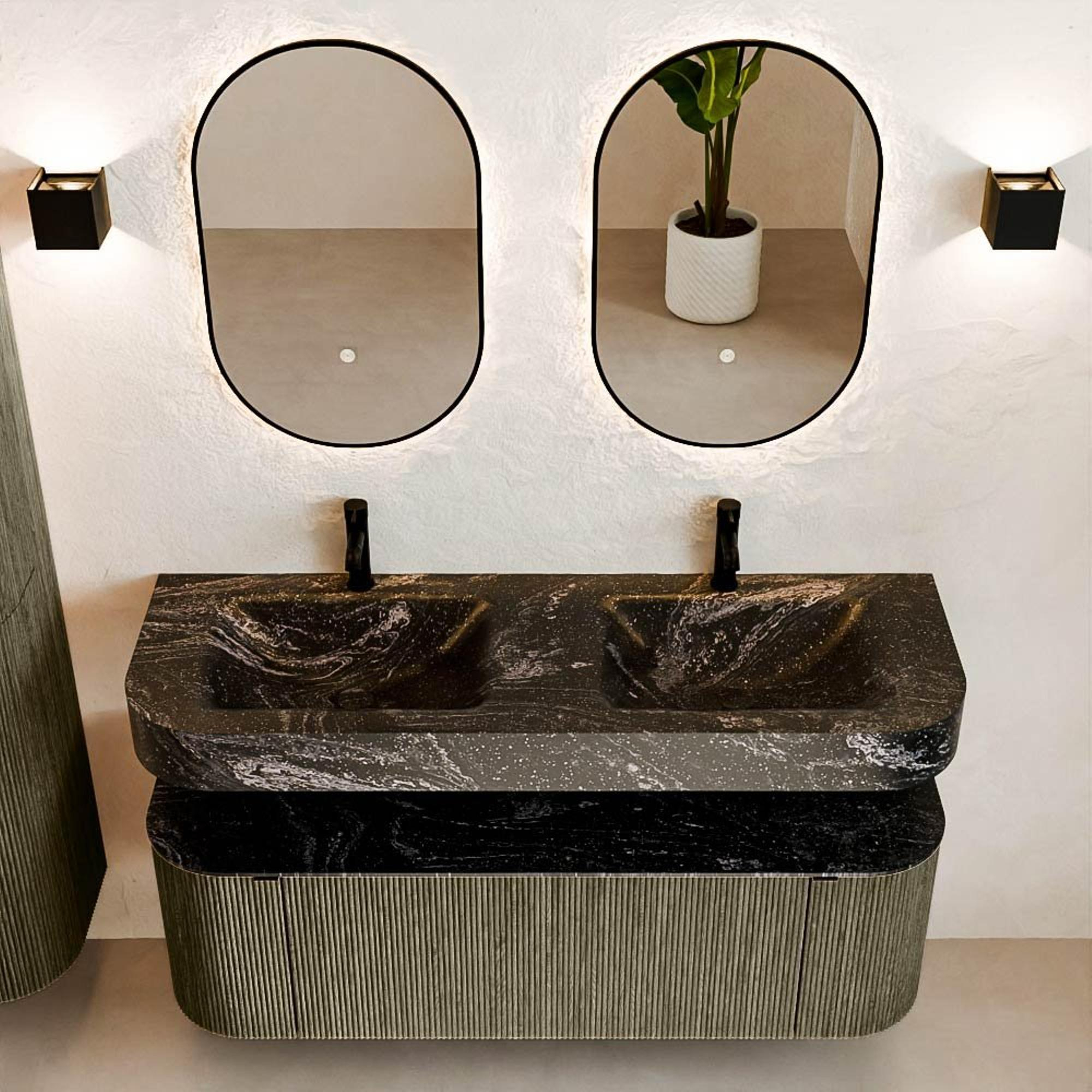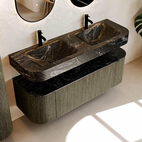 MONDIAZ THOR-DLUX 140cm meuble de salle de bains arrondi gauche + droite couleur Shadow avec 1 tiroir et 2 portes. Vasque suspendue CLOUD Double 2 trous de robinet couleur Lava.