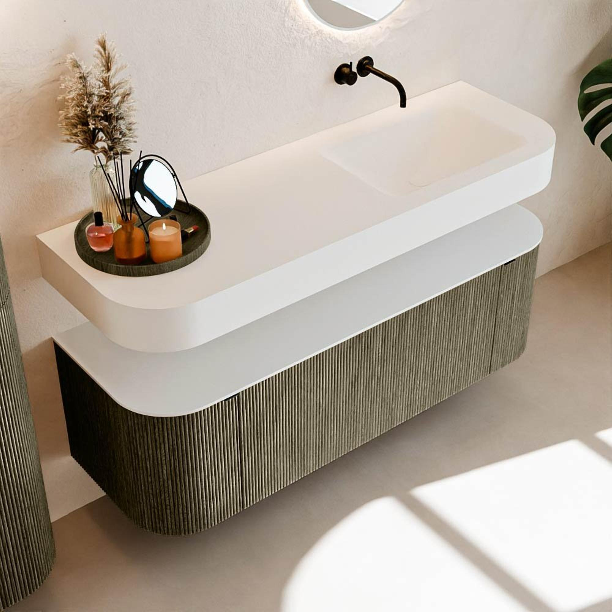 Au-dessus du meuble flotte une vasque suspendue assortie aux coins arrondis – parfaitement adaptée à la forme du meuble. La vasque est réalisée en Solid Surface et suit subtilement les lignes du meuble inférieur, créant ainsi un ensemble harmonieux. Le plan de travail en Solid Surface forme une base solide, facile d'entretien et complète la combinaison.