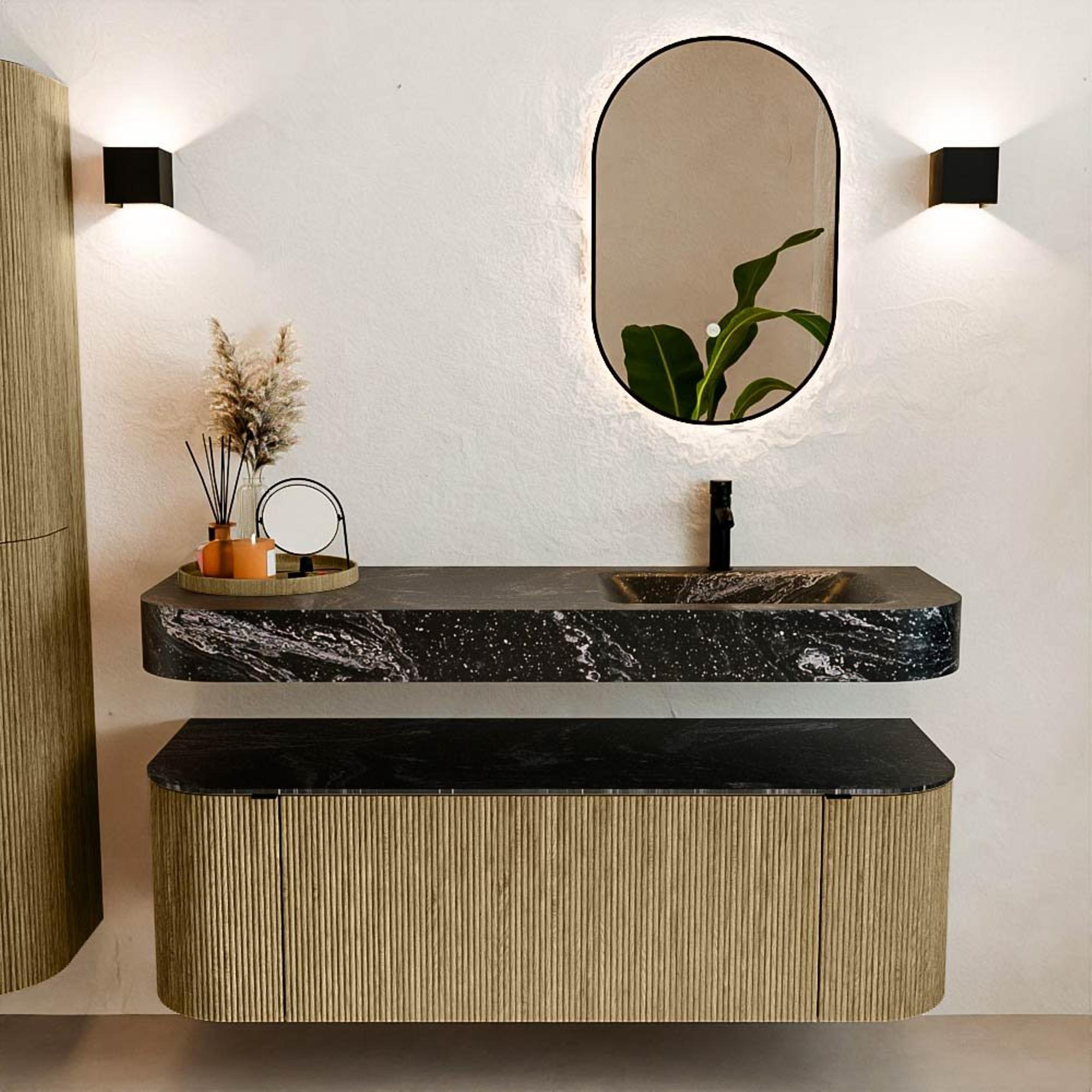 Matériaux naturels dans des tons chauds. Les côtes verticales apportent rythme et texture au design, tandis que le chêne confère une apparence chaleureuse et artisanale. Choisissez parmi 5 teintes de bois OAK, WALNUT, DUSK, SHADOW et RUBY, des couleurs de bois soigneusement sélectionnées pour enrichir les salles de bains modernes et classiques.