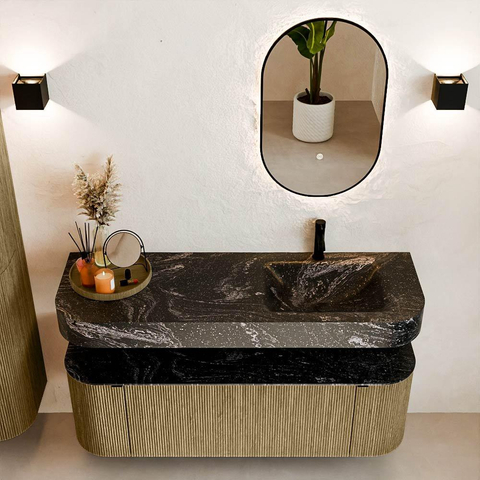 MONDIAZ THOR-DLUX 140cm meuble de salle de bains arrondi gauche + droite couleur Dusk avec 1 tiroir et 2 portes. Vasque suspendue CLOUD Droite 1 trou de robinet couleur Lava.