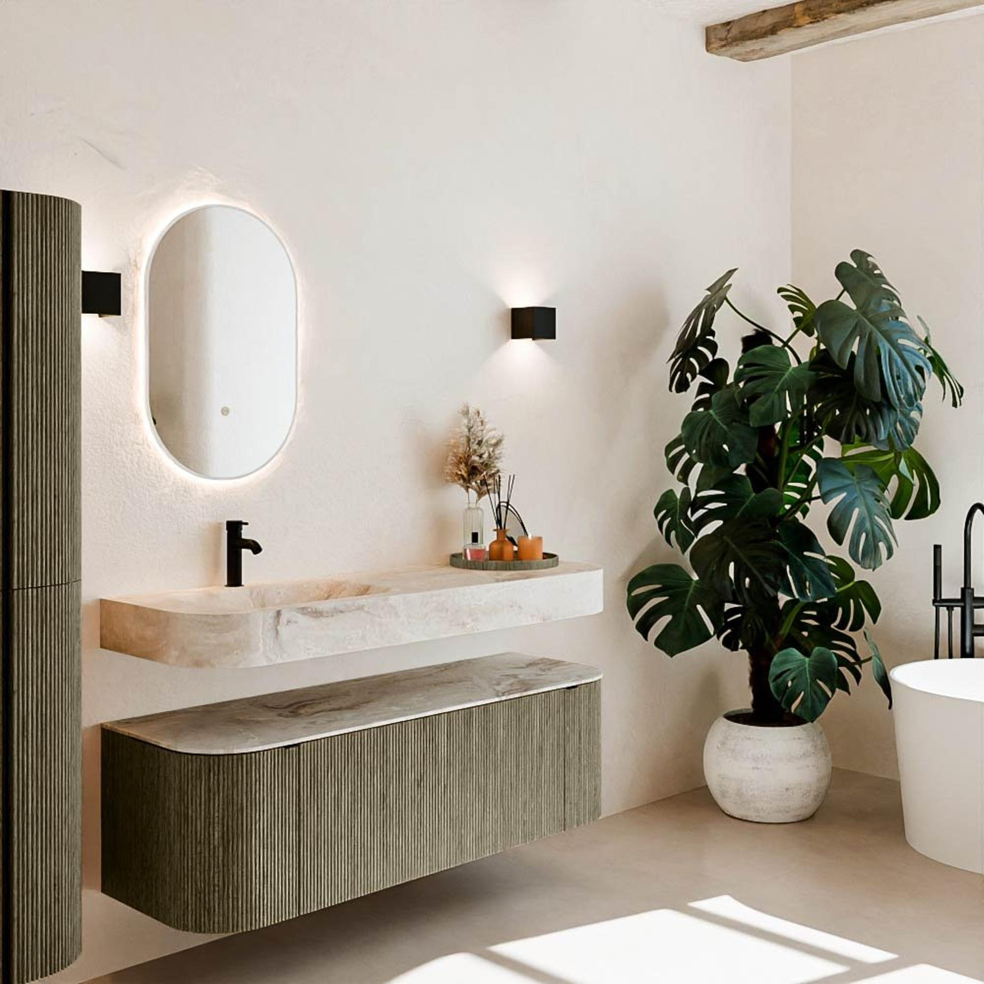 Matériaux naturels aux teintes chaudes. Les nervures verticales apportent rythme et texture au design, tandis que le chêne confère une apparence chaleureuse et artisanale. Choisissez parmi 5 teintes de bois OAK, WALNUT, DUSK, SHADOW et RUBY, des couleurs de bois soigneusement sélectionnées pour enrichir les salles de bains modernes et classiques.