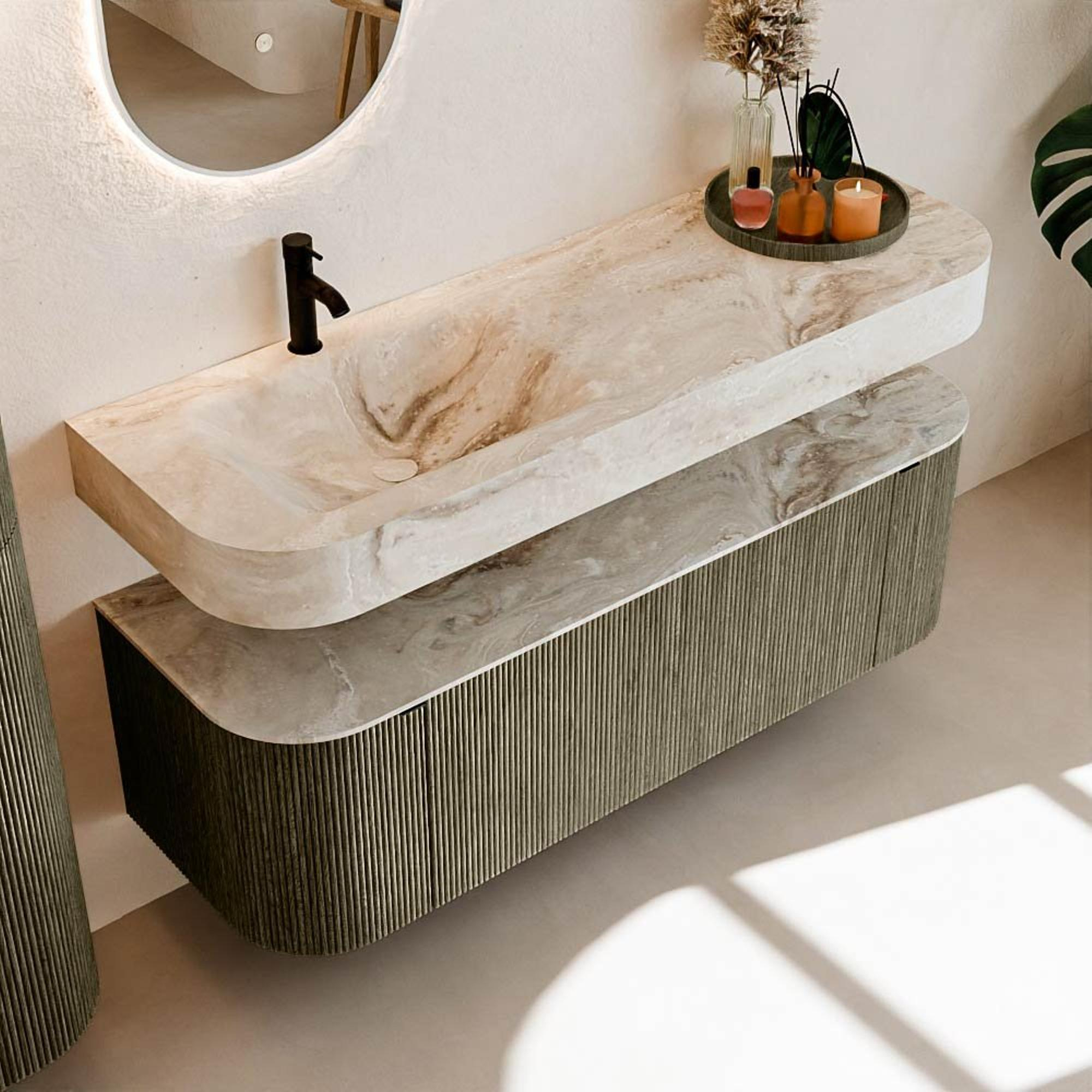 Au-dessus du meuble flotte une vasque suspendue assortie aux coins arrondis – parfaitement adaptée à la forme du meuble. La vasque est réalisée en Solid Surface et suit subtilement les lignes du meuble inférieur, créant ainsi un ensemble harmonieux. Le plan de travail en Solid Surface forme une base solide, facile d'entretien, et complète la combinaison.