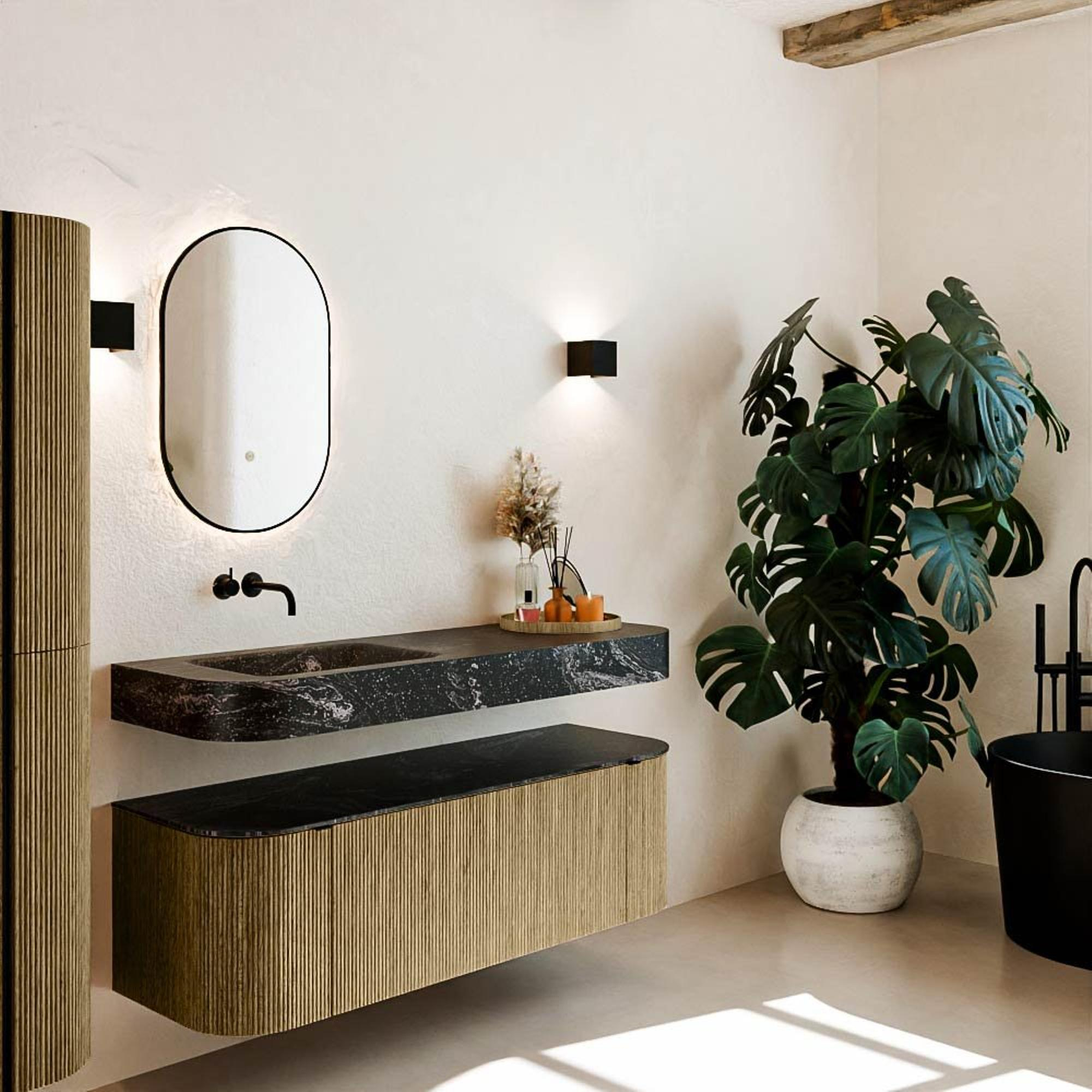 Matériaux naturels dans des tons chauds. Les nervures verticales apportent rythme et texture au design, tandis que le chêne confère une apparence chaleureuse et artisanale. Choisissez parmi 5 teintes de bois OAK, WALNUT, DUSK, SHADOW et RUBY, des couleurs de bois soigneusement sélectionnées pour enrichir les salles de bains modernes et classiques.