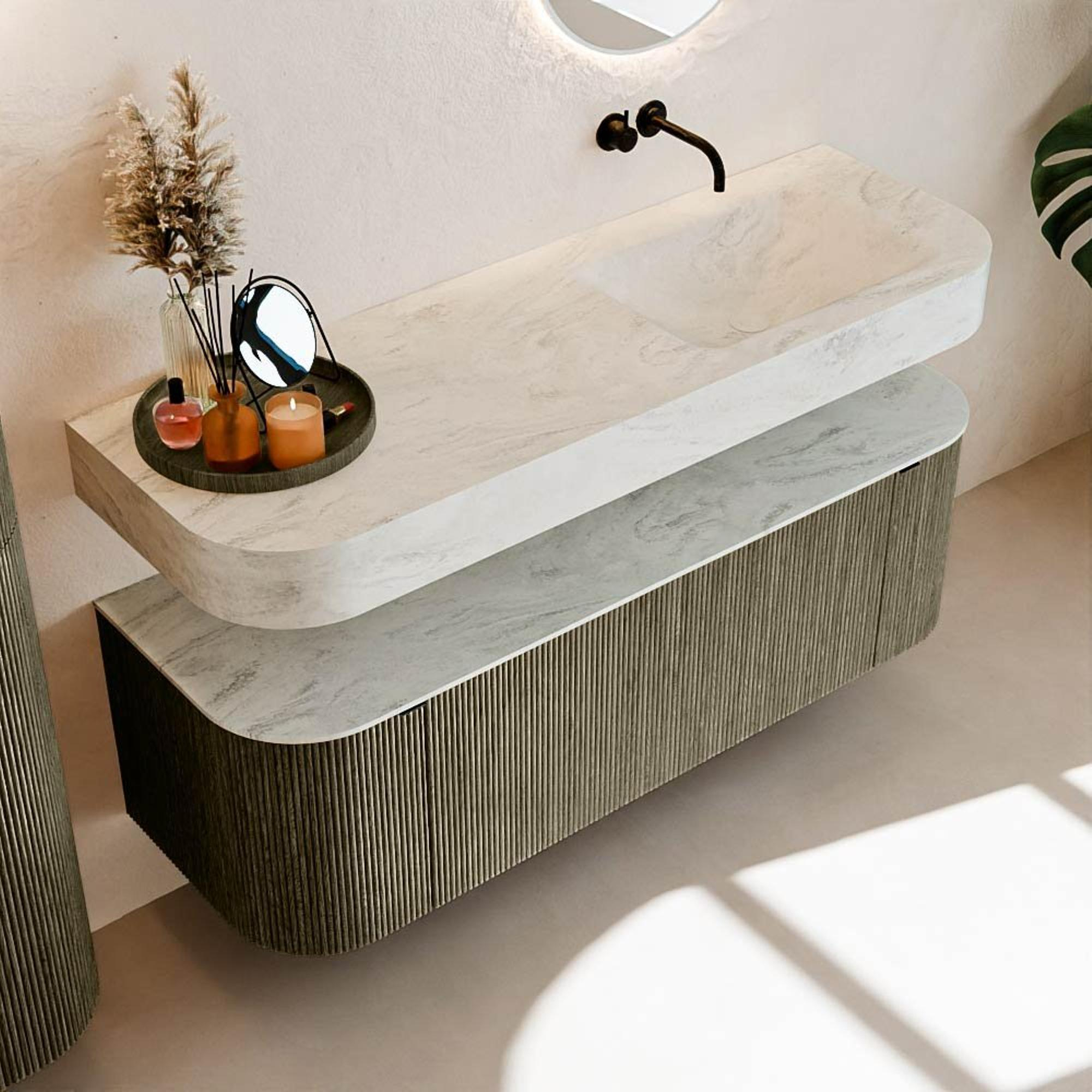 Au-dessus du meuble flotte une vasque suspendue assortie aux coins arrondis – parfaitement adaptée à la forme du meuble. La vasque est réalisée en Solid Surface et suit subtilement les lignes du meuble inférieur, créant une harmonie parfaite. Le plan de travail en Solid Surface forme une base solide et facile d'entretien et complète l'ensemble.