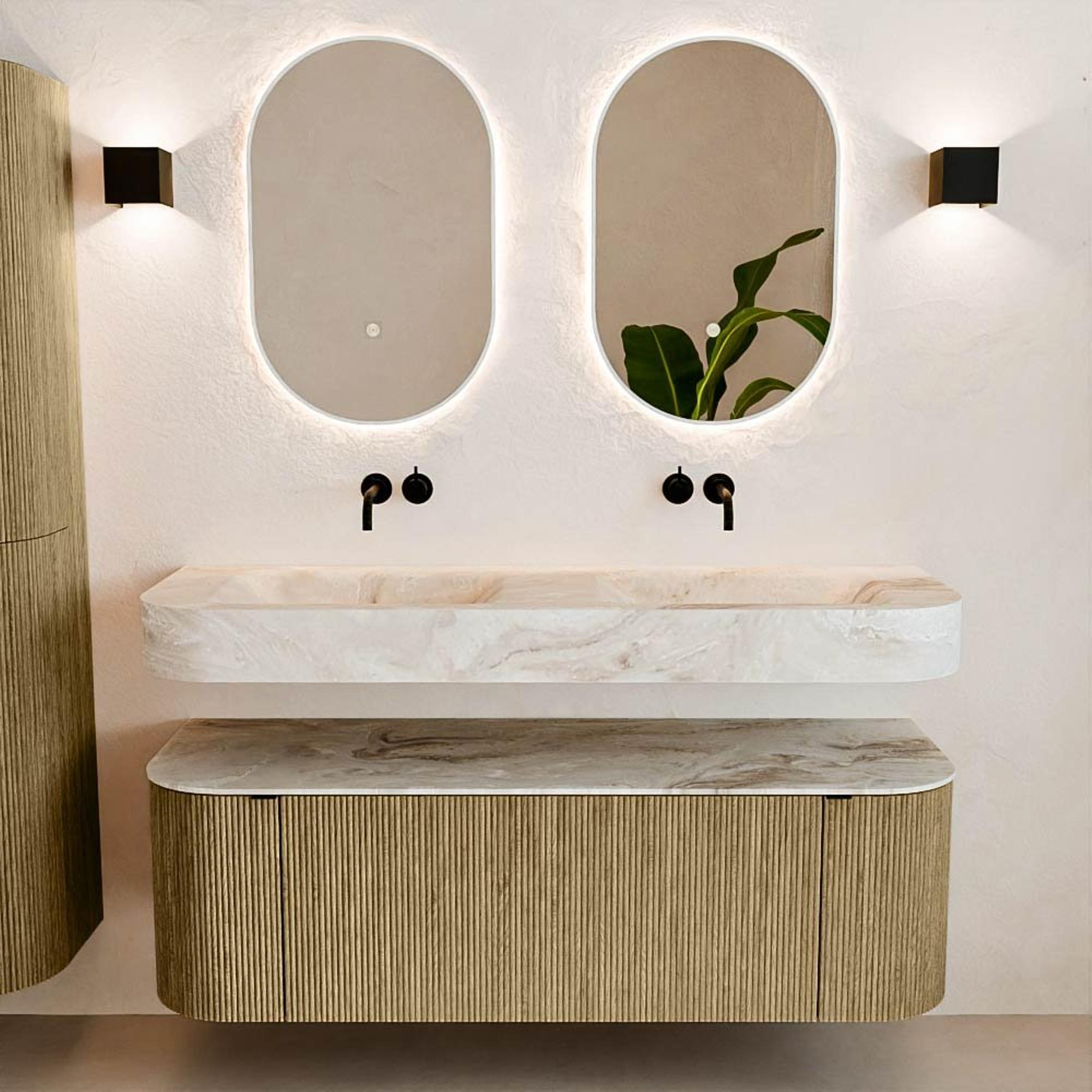 Matériaux naturels dans des tons chauds. Les cannelures verticales apportent rythme et texture au design, tandis que le chêne confère une apparence chaleureuse et artisanale. Choisissez parmi 5 teintes de bois OAK, WALNUT, DUSK, SHADOW et RUBY, des couleurs de bois soigneusement sélectionnées pour enrichir aussi bien les salles de bains modernes que classiques.