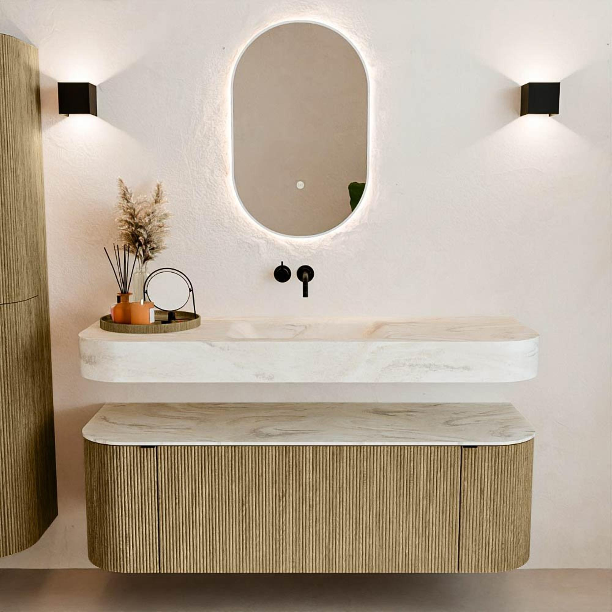 Au-dessus du meuble flotte une vasque suspendue assortie aux coins arrondis – parfaitement adaptée à la forme du meuble. La vasque est réalisée en Solid Surface et suit subtilement les lignes du meuble inférieur, créant ainsi un ensemble harmonieux. Le plan de travail en Solid Surface forme une base solide, facile d'entretien, et complète la combinaison.
