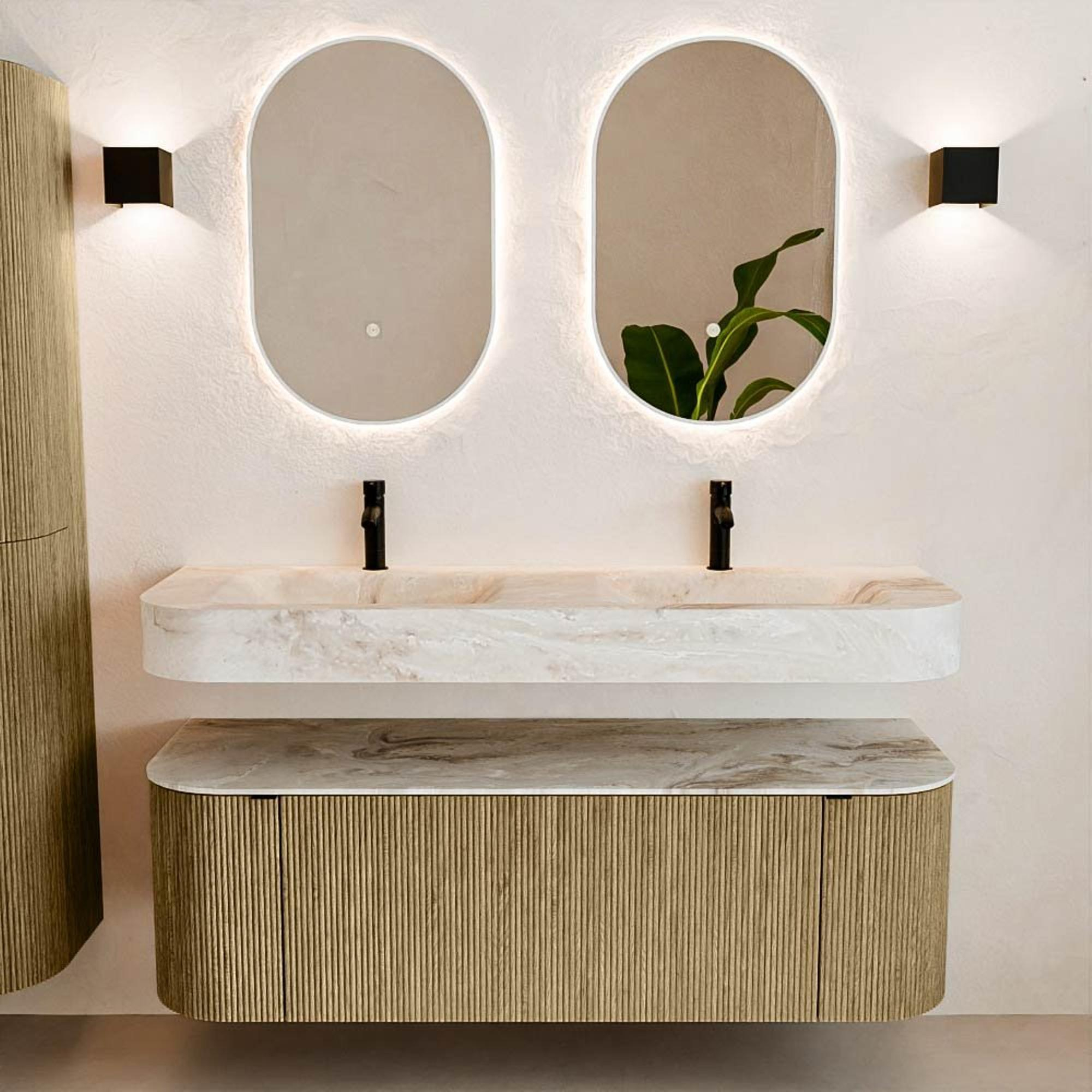 Matériaux naturels dans des tons chauds. Les reliefs verticaux apportent rythme et texture au design, tandis que le chêne confère une apparence chaleureuse et artisanale. Choisissez parmi 5 teintes de bois OAK, WALNUT, DUSK, SHADOW et RUBY, des couleurs de bois soigneusement sélectionnées pour enrichir les salles de bains modernes et classiques.