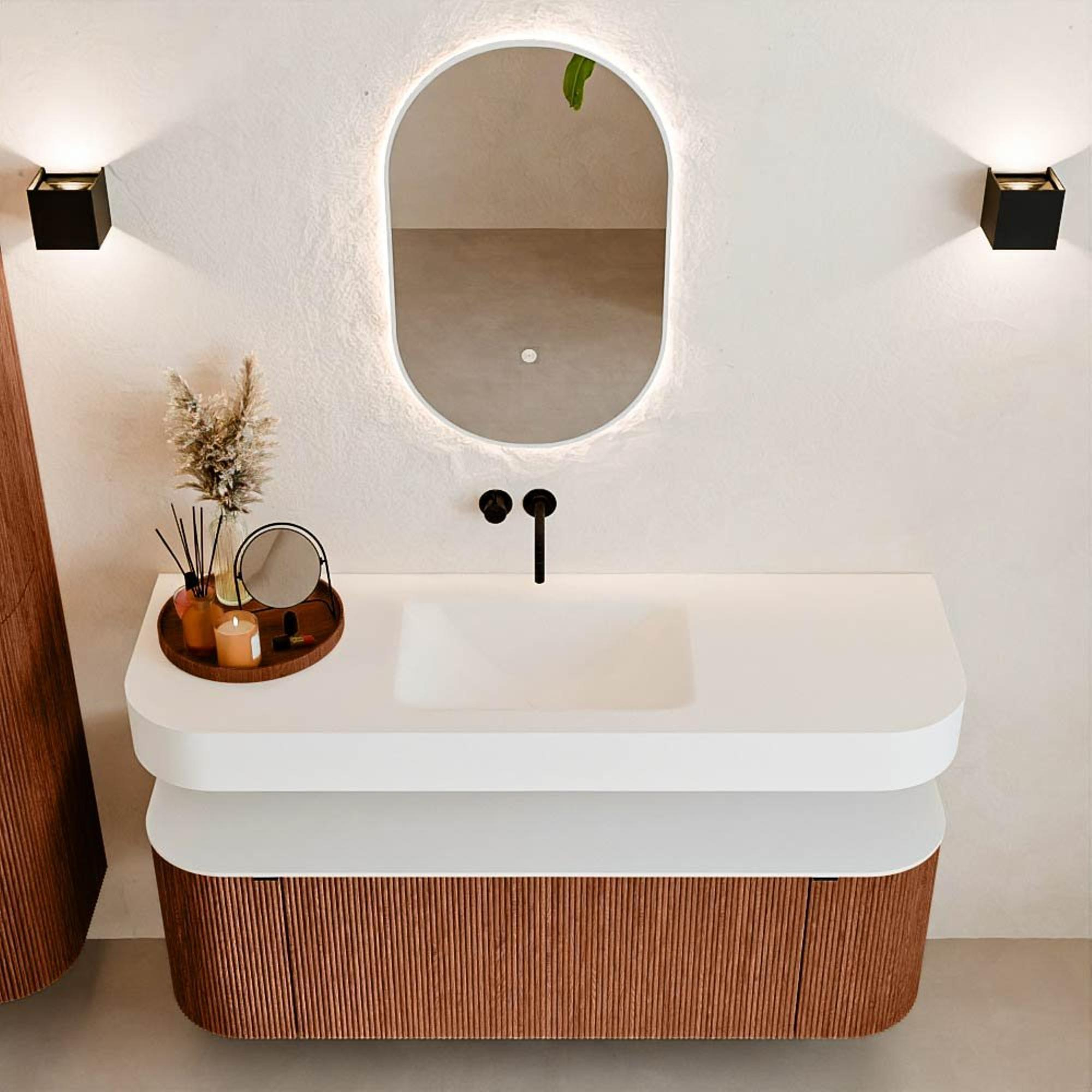 Au-dessus du meuble flotte une vasque suspendue assortie aux coins arrondis – parfaitement adaptée à la forme du meuble. La vasque est réalisée en Solid Surface et suit subtilement les lignes du meuble inférieur, créant ainsi un ensemble harmonieux. Le plan de travail en Solid Surface forme une base solide et facile d'entretien, complétant la combinaison.