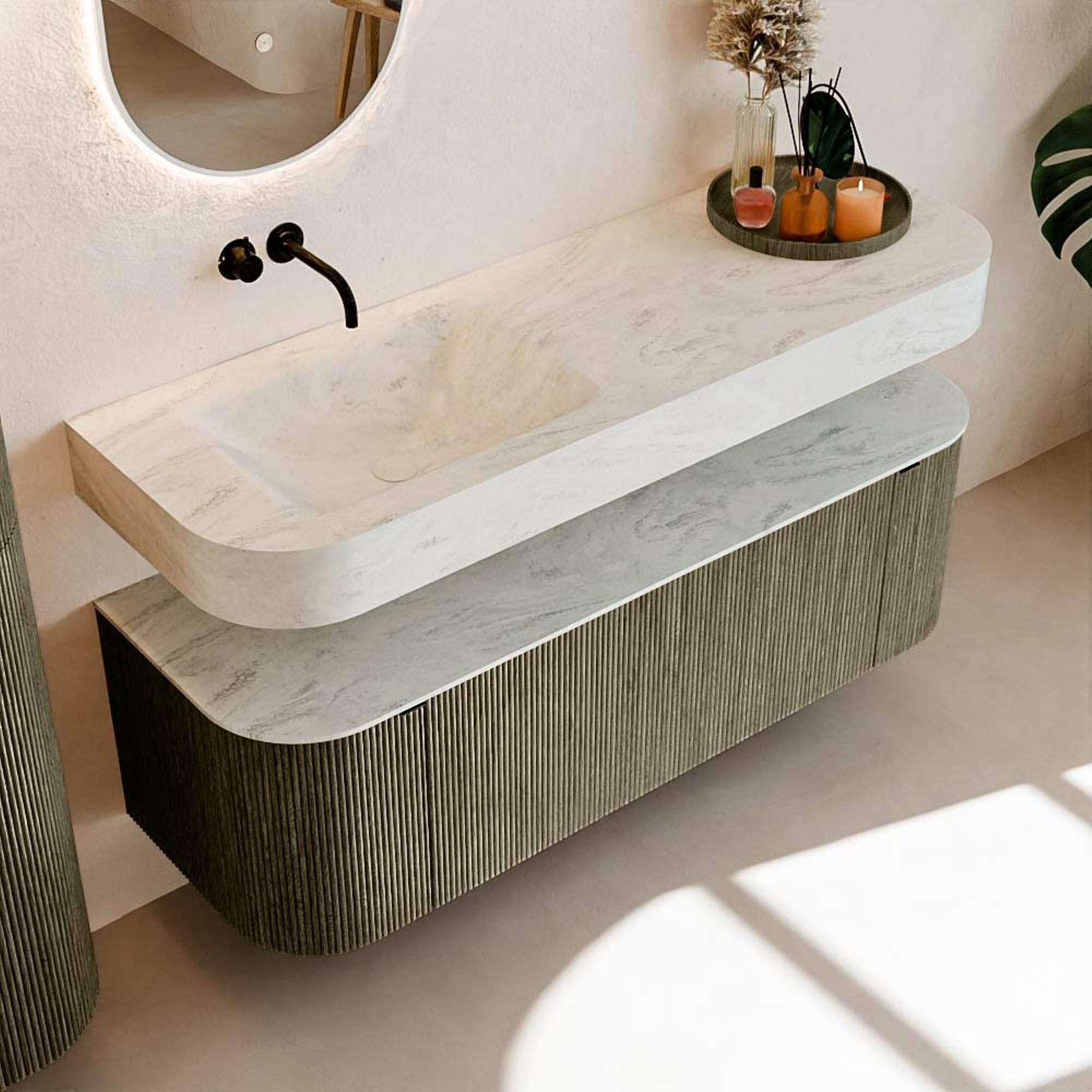 Au-dessus du meuble flotte une vasque suspendue assortie aux coins arrondis – parfaitement adaptée à la forme du meuble. La vasque est en Solid Surface et suit subtilement les lignes du meuble inférieur, créant une harmonie parfaite. Le plan de travail en Solid Surface forme une base solide, facile d'entretien, complétant la combinaison.