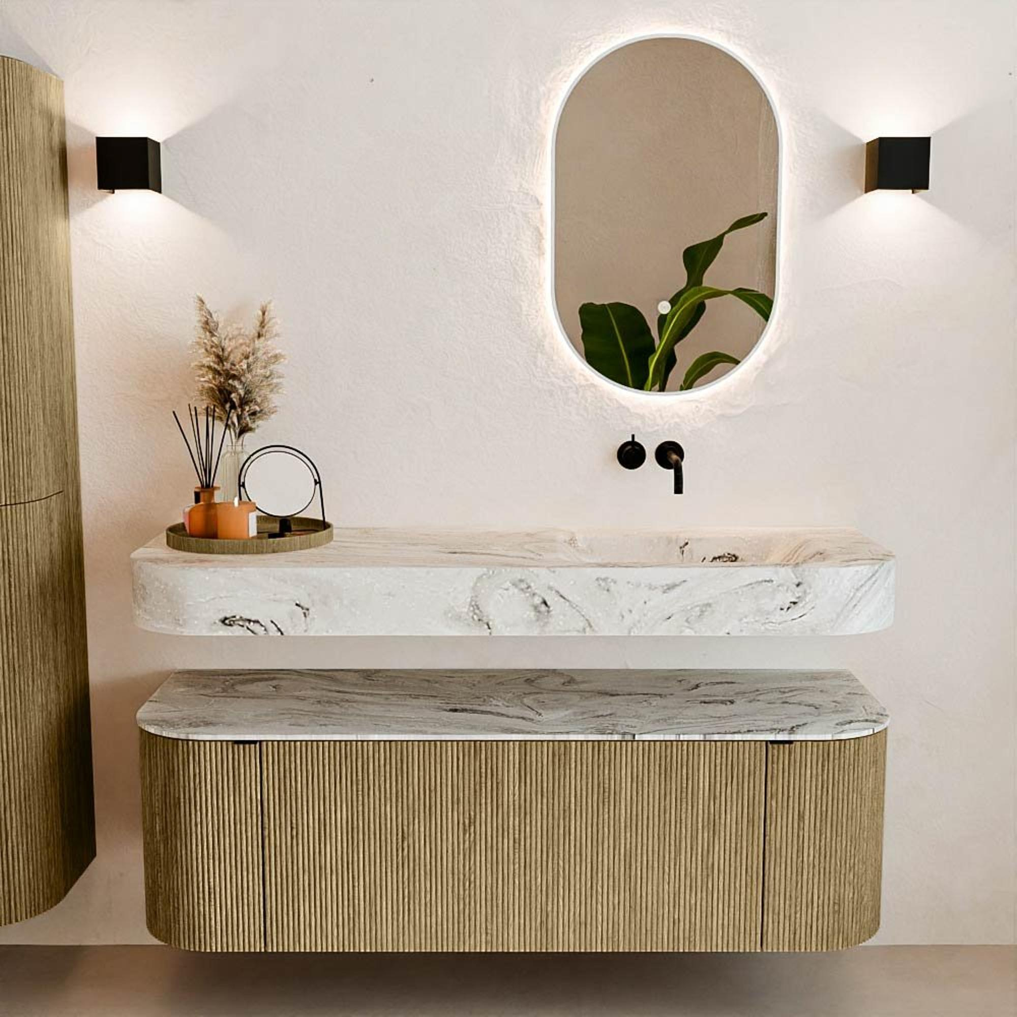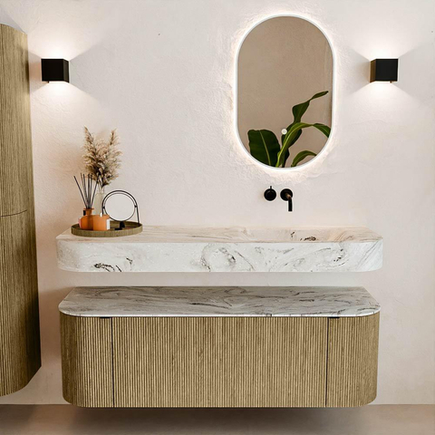 Au-dessus du meuble flotte une vasque suspendue assortie aux coins arrondis – parfaitement adaptée à la forme du meuble. La vasque est réalisée en Solid Surface et suit subtilement les lignes du meuble inférieur, créant ainsi un ensemble harmonieux. Le plan de travail en Solid Surface forme une base solide et facile d'entretien et complète la combinaison.