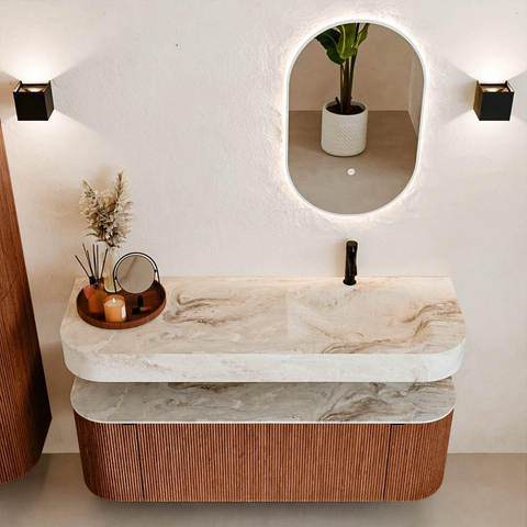 Au-dessus du meuble flotte une vasque suspendue assortie aux coins arrondis – parfaitement adaptée à la forme du meuble. La vasque est en Solid Surface et suit subtilement les lignes du meuble inférieur, créant un ensemble harmonieux. Le plan de travail en Solid Surface constitue une base solide et facile d'entretien, complétant la combinaison.