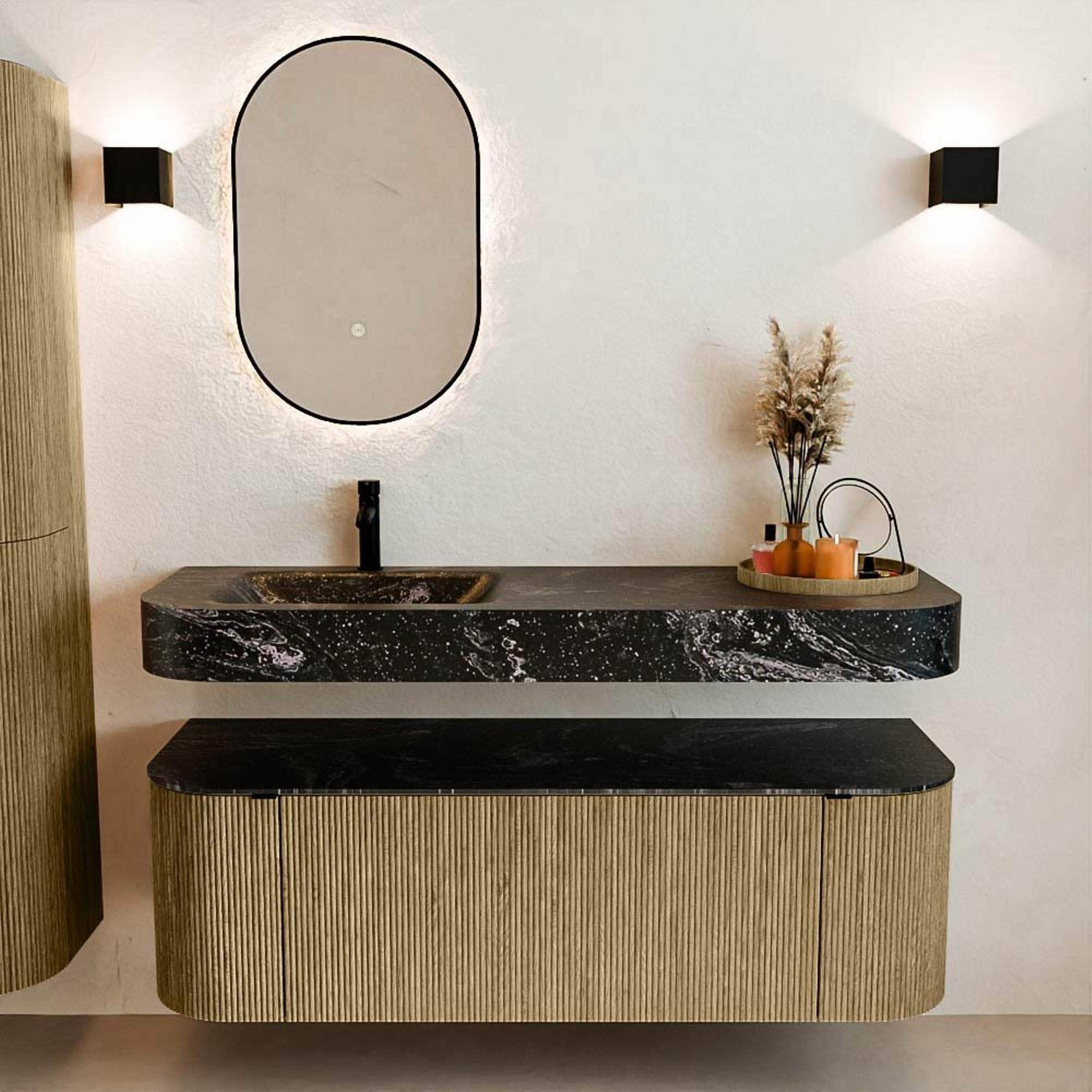Matériaux naturels dans des tons chauds. Les nervures verticales apportent rythme et texture au design, tandis que le chêne confère une apparence chaleureuse et artisanale. Choisissez parmi 5 teintes de bois OAK, WALNUT, DUSK, SHADOW et RUBY, des couleurs de bois soigneusement sélectionnées pour enrichir les salles de bains modernes et classiques.