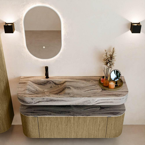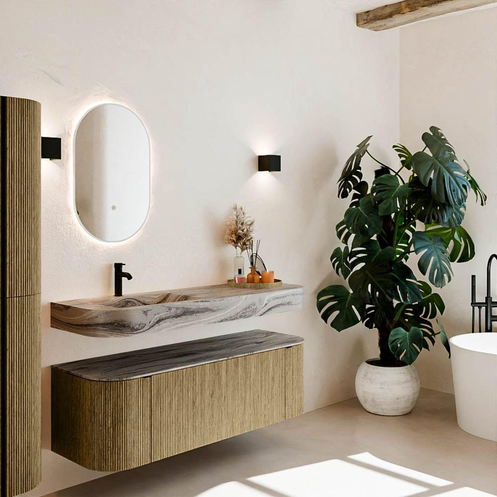 Matériaux naturels dans des tons chauds. Les nervures verticales apportent rythme et texture au design, tandis que le chêne confère une apparence chaleureuse et artisanale. Choisissez parmi 5 teintes de bois OAK, WALNUT, DUSK, SHADOW et RUBY, des couleurs de bois soigneusement sélectionnées pour enrichir les salles de bains modernes et classiques.