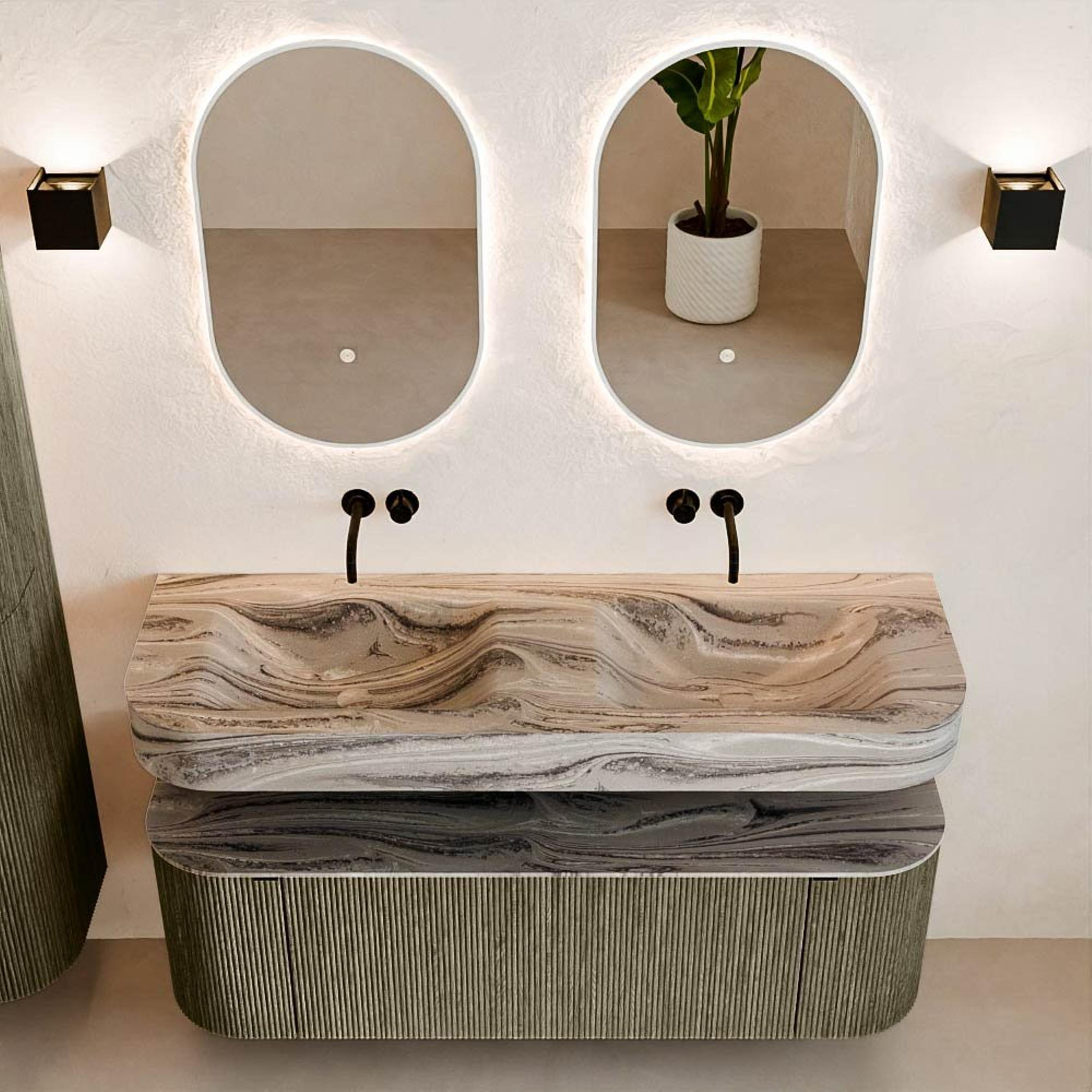 Matériaux naturels aux teintes chaudes. Les nervures verticales apportent rythme et texture au design, tandis que le chêne confère une apparence chaleureuse et artisanale. Choisissez parmi 5 teintes de bois OAK, WALNUT, DUSK, SHADOW et RUBY, des couleurs de bois soigneusement sélectionnées pour enrichir les salles de bains modernes et classiques.