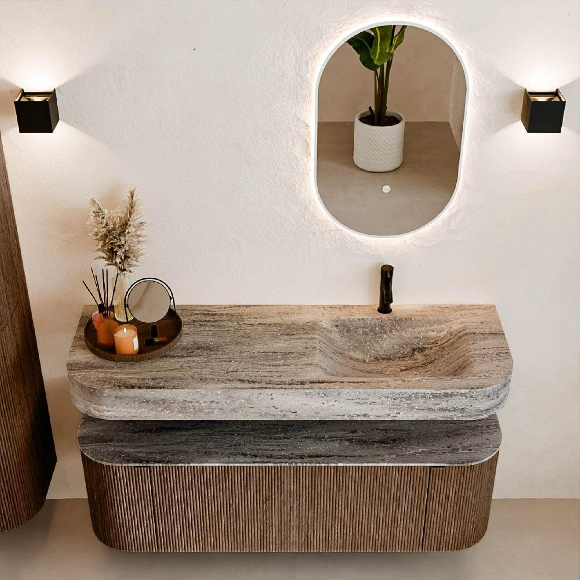 Matériaux naturels dans des tons chauds. Les nervures verticales apportent rythme et texture au design, tandis que le chêne confère une apparence chaleureuse et artisanale. Choisissez parmi 5 teintes de bois OAK, WALNUT, DUSK, SHADOW et RUBY, des couleurs de bois soigneusement sélectionnées pour enrichir les salles de bains modernes et classiques.