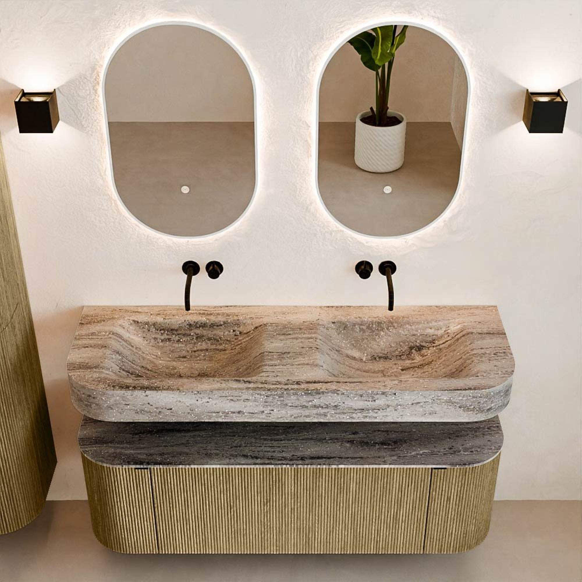 Matériaux naturels dans des tons chauds. Les nervures verticales apportent rythme et texture au design, tandis que le chêne confère une apparence chaleureuse et artisanale. Choisissez parmi 5 teintes de bois OAK, WALNUT, DUSK, SHADOW et RUBY, des couleurs de bois soigneusement sélectionnées pour enrichir les salles de bains modernes et classiques.