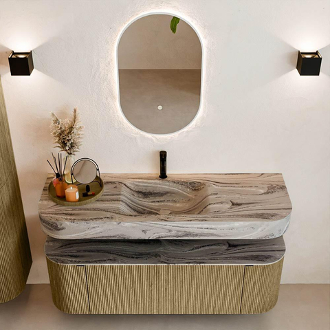Matériaux naturels dans des tons chauds. Les nervures verticales apportent rythme et texture au design, tandis que le chêne confère une apparence chaleureuse et artisanale. Choisissez parmi 5 teintes de bois OAK, WALNUT, DUSK, SHADOW et RUBY, des couleurs de bois soigneusement sélectionnées pour enrichir les salles de bains modernes et classiques.