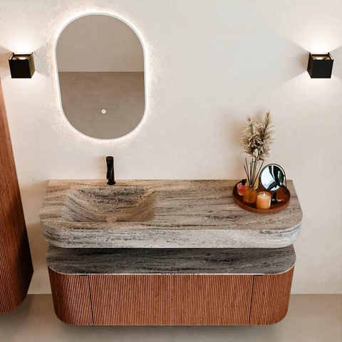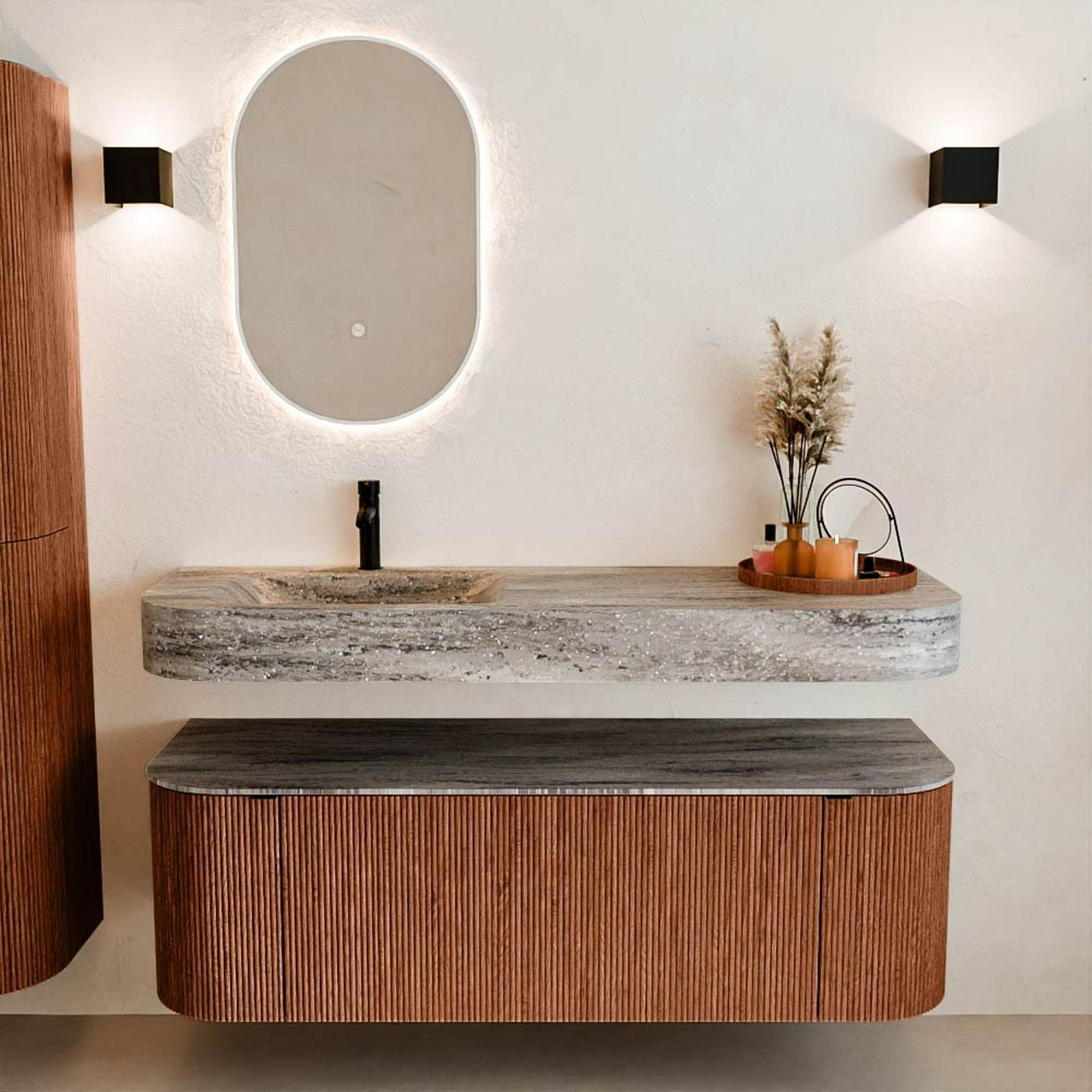 Matériaux naturels dans des tons chauds. Les nervures verticales apportent rythme et texture au design, tandis que le chêne confère une apparence chaleureuse et artisanale. Choisissez parmi 5 teintes de bois OAK, WALNUT, DUSK, SHADOW et RUBY, des couleurs de bois soigneusement sélectionnées pour enrichir les salles de bains modernes et classiques.