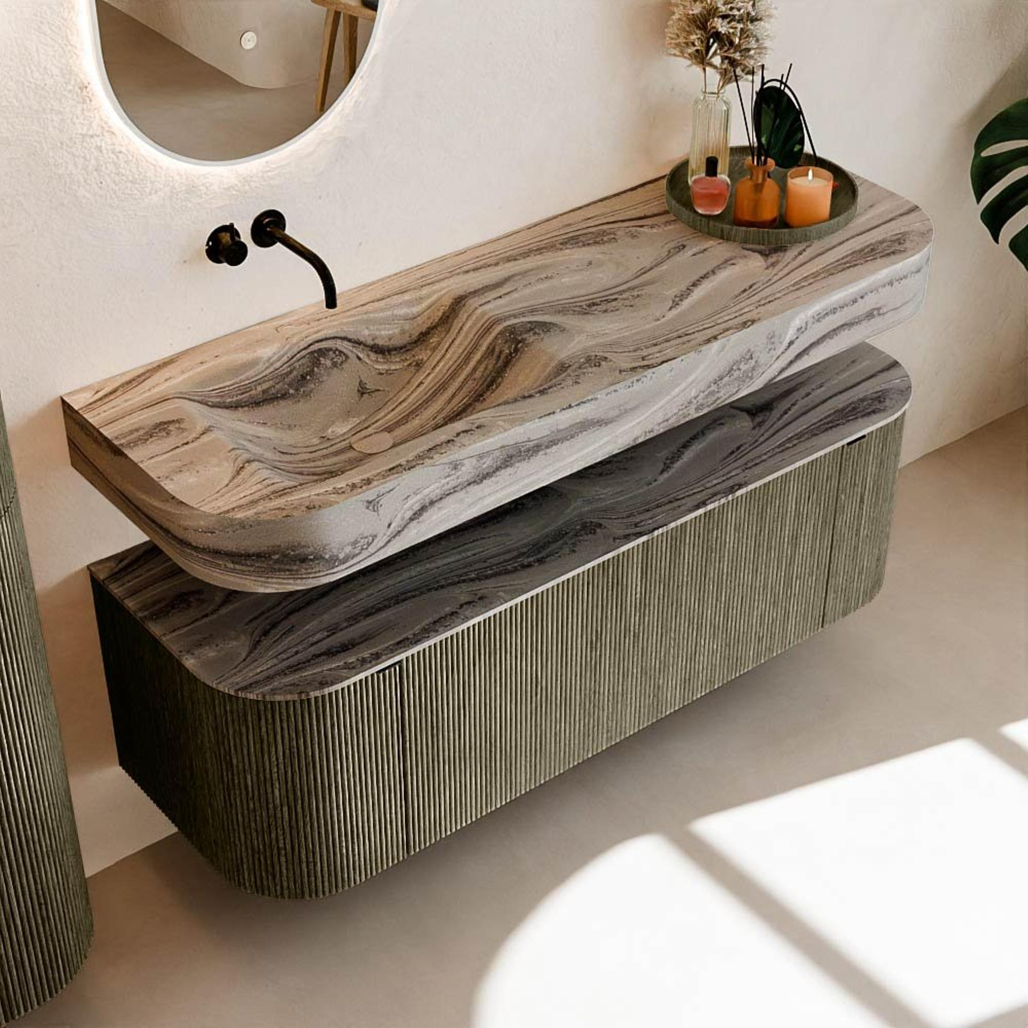 Au-dessus du meuble flotte une vasque suspendue assortie aux coins arrondis – parfaitement adaptée à la forme du meuble. La vasque est en Solid Surface et suit subtilement les lignes du meuble inférieur, créant une harmonie parfaite. Le plan de travail en Solid Surface forme une base solide, facile d'entretien et complète la combinaison.