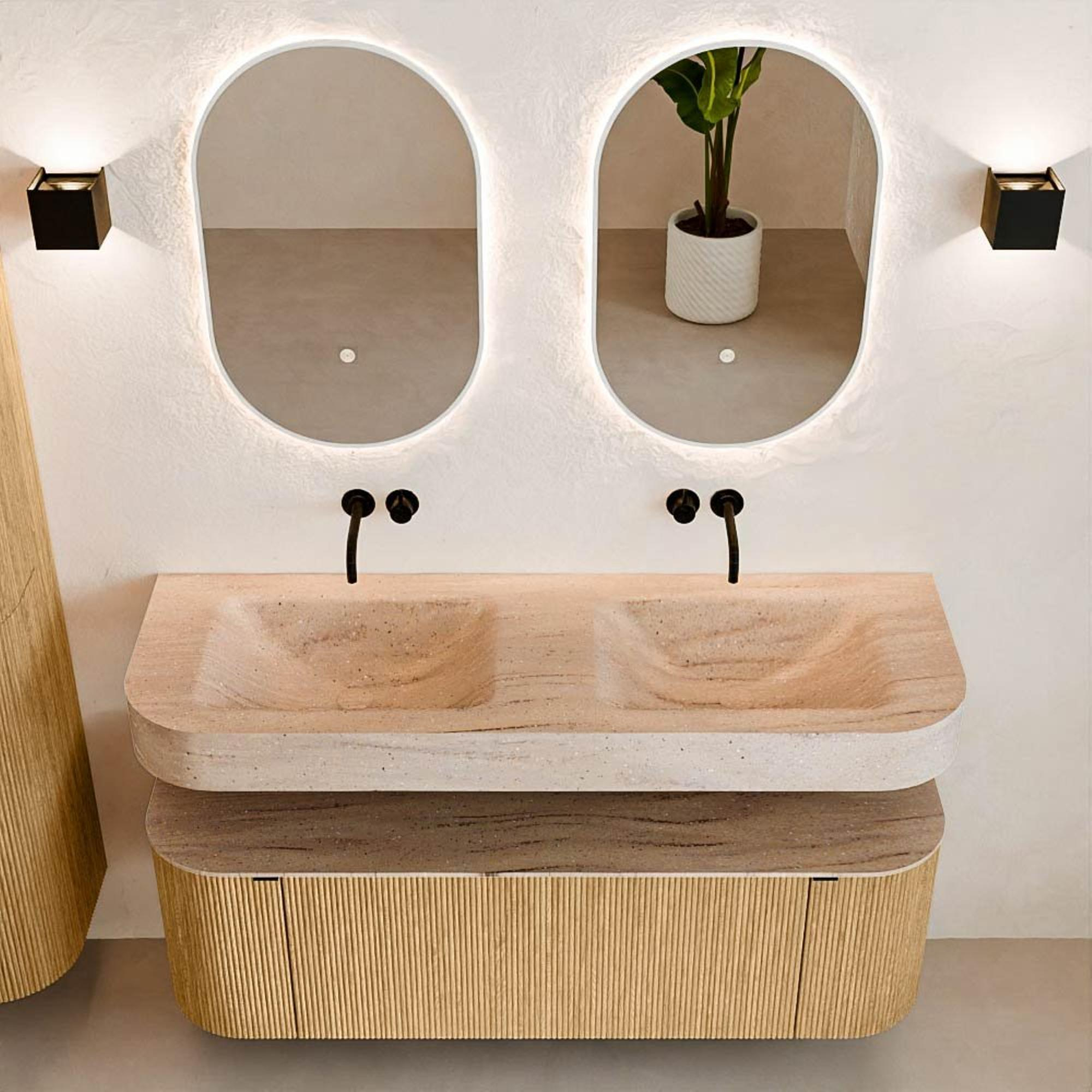 MONDIAZ THOR-DLUX 140cm meuble de salle de bains arrondi gauche + droite couleur Oak avec 1 tiroir et 2 portes. Vasque suspendue CLOUD Double sans trou de robinet couleur Saba.