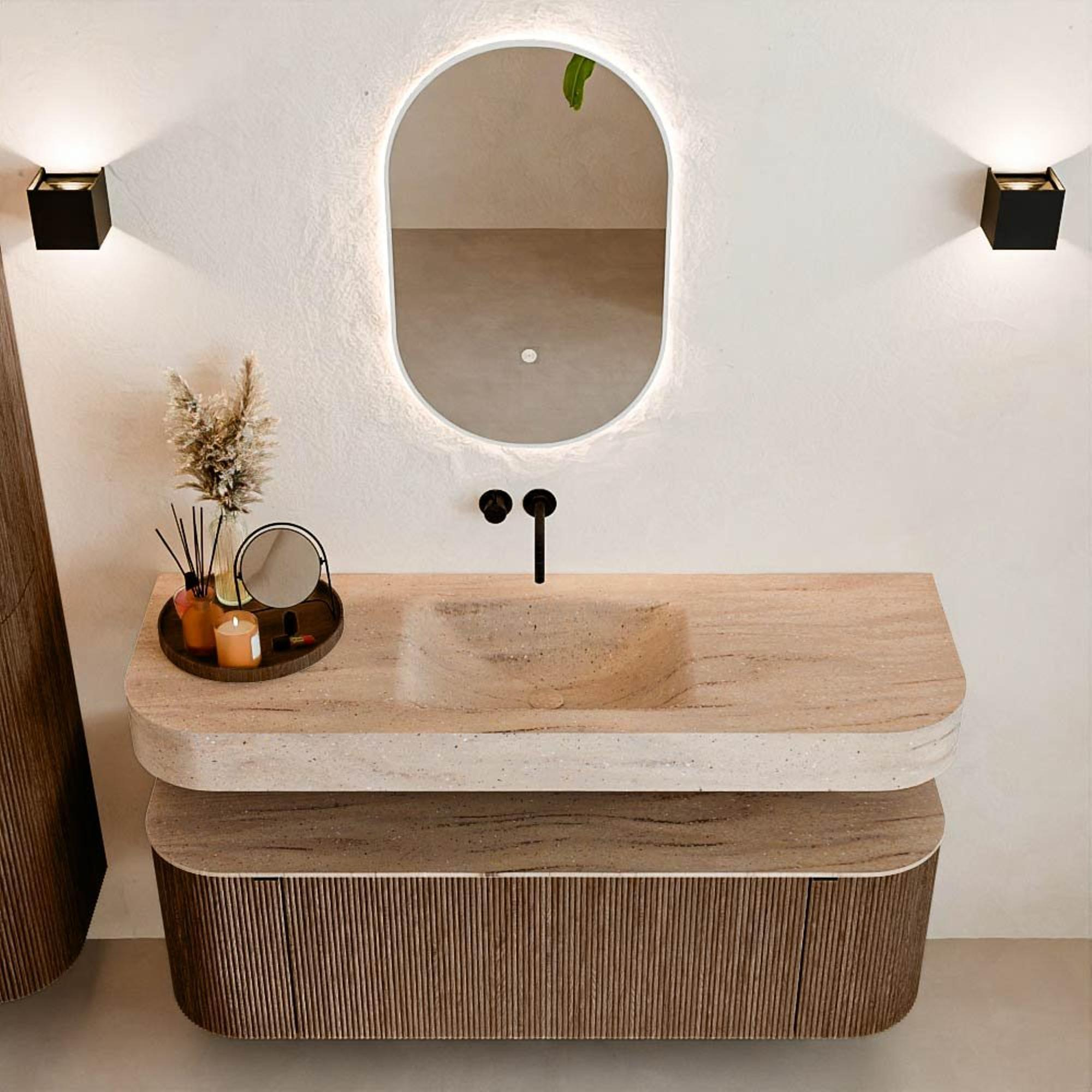 Matériaux naturels dans des tons chauds. Les nervures verticales apportent rythme et texture au design, tandis que le chêne confère une apparence chaleureuse et artisanale. Choisissez parmi 5 teintes de bois OAK, WALNUT, DUSK, SHADOW et RUBY, des couleurs de bois soigneusement sélectionnées pour enrichir les salles de bains modernes et classiques.