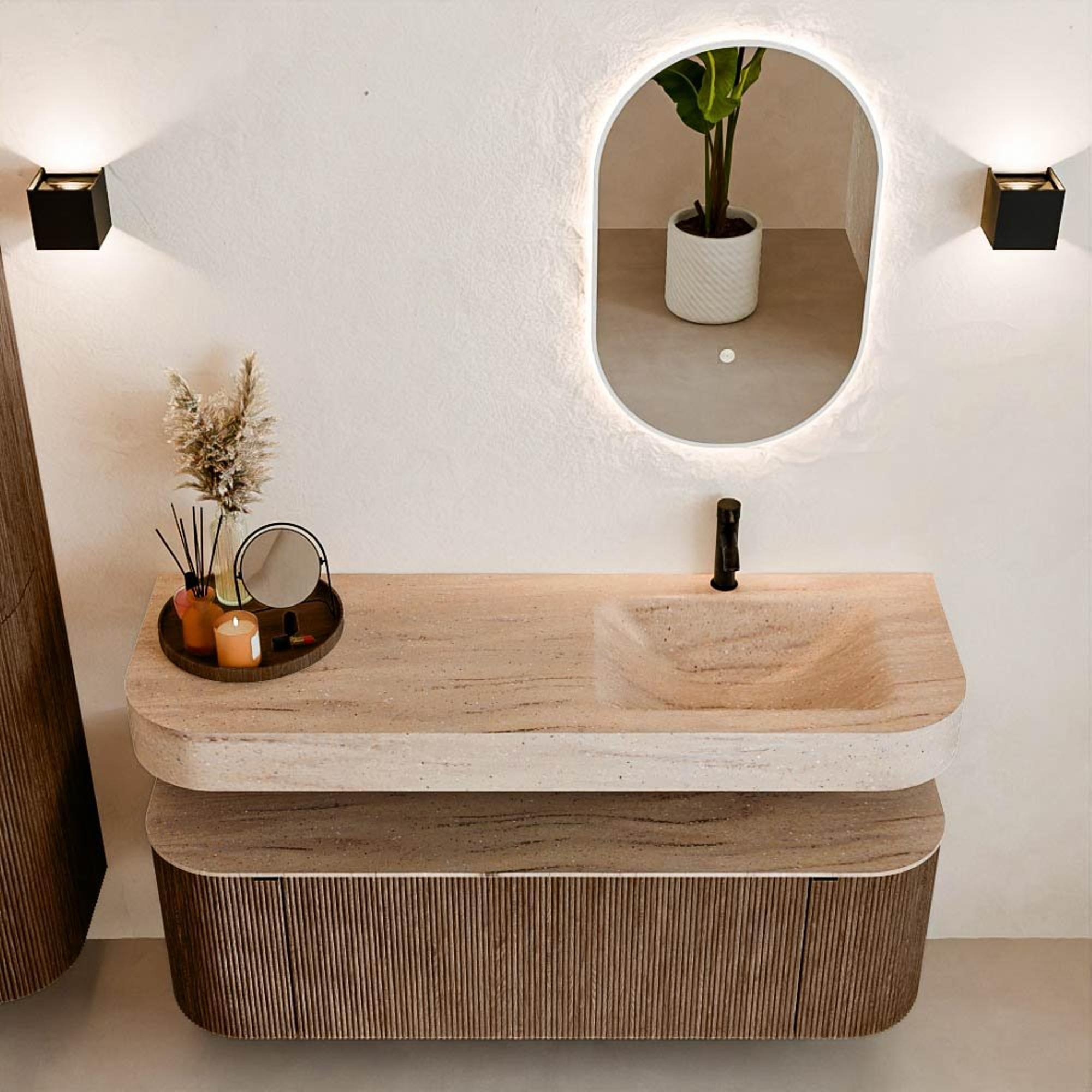 Matériaux naturels dans des tons chauds. Les cannelures verticales apportent rythme et texture au design, tandis que le chêne confère une apparence chaleureuse et artisanale. Choisissez parmi 5 teintes de bois OAK, WALNUT, DUSK, SHADOW et RUBY, des couleurs de bois soigneusement sélectionnées pour enrichir les salles de bains modernes et classiques.