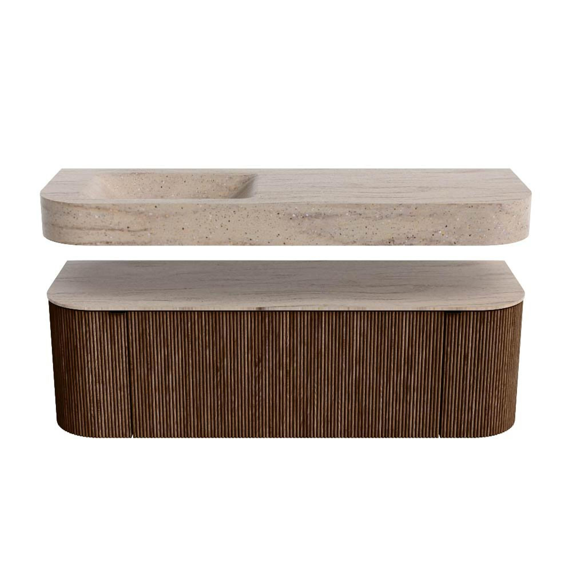 MONDIAZ THOR-DLUX 140cm meuble de salle de bains arrondi gauche + droite couleur Walnut avec 1 tiroir et 2 portes. Vasque suspendue CLOUD Gauche 1 trou de robinet couleur Saba.