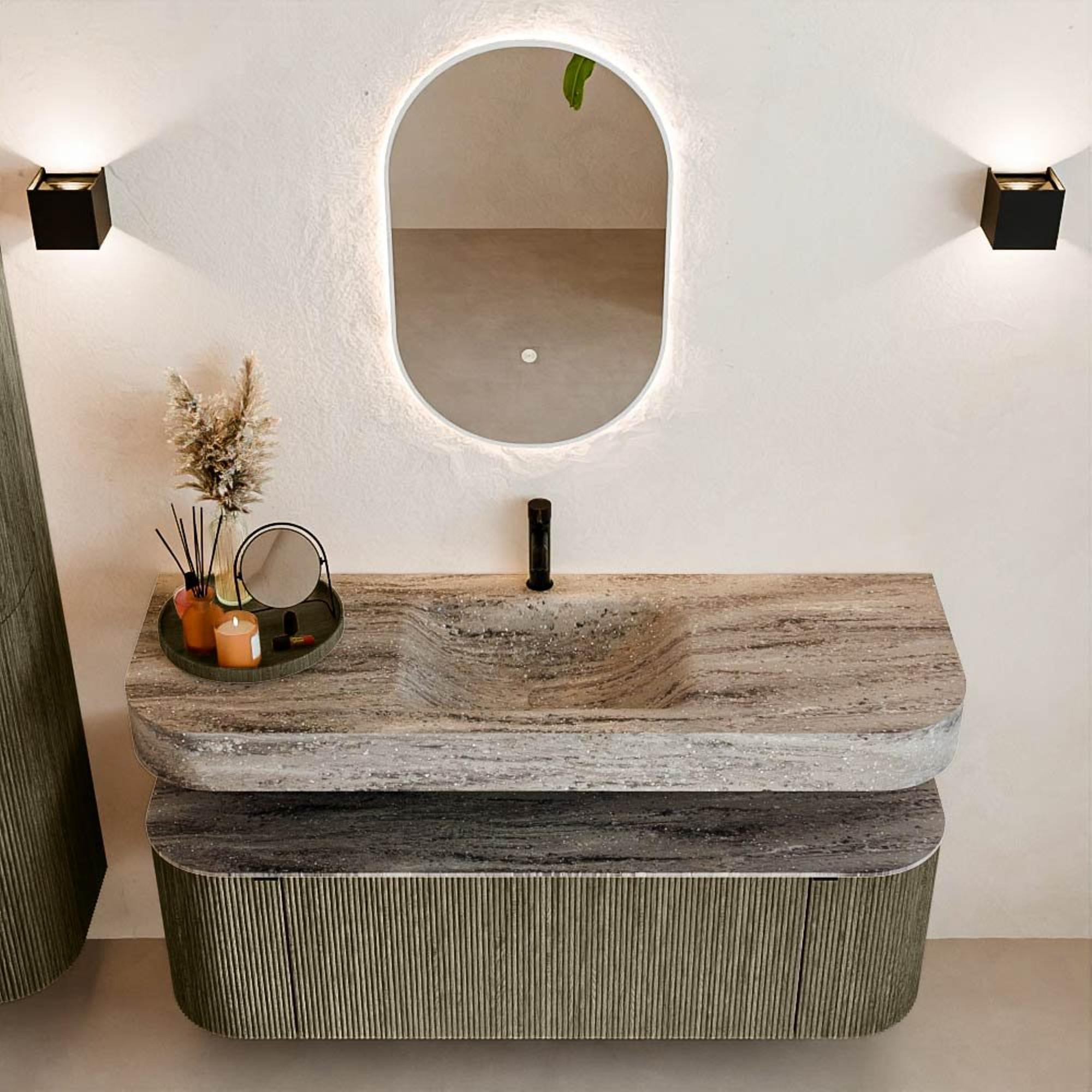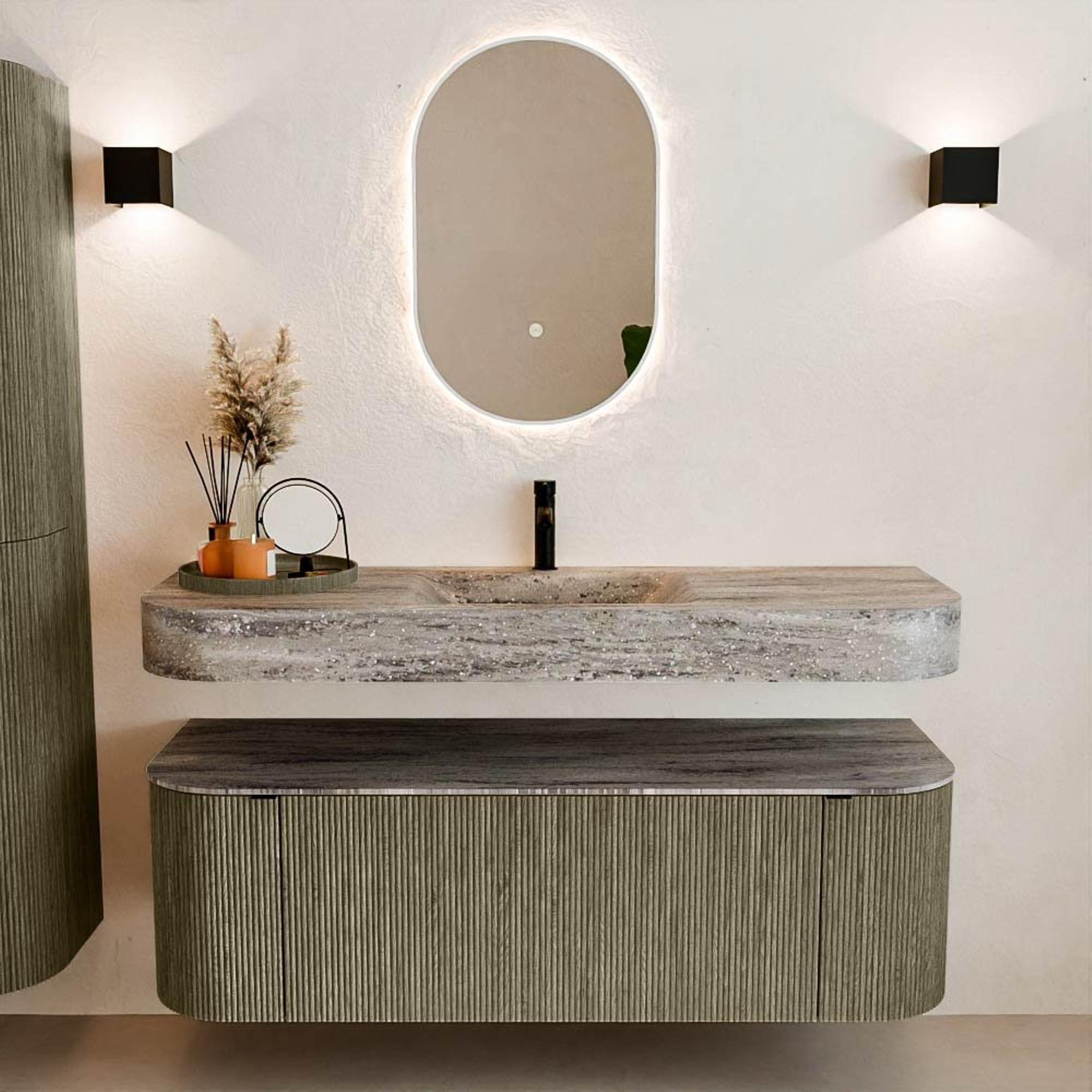Matériaux naturels dans des tons chauds. Les nervures verticales apportent rythme et texture au design, tandis que le chêne confère une apparence chaleureuse et artisanale. Choisissez parmi 5 teintes de bois OAK, WALNUT, DUSK, SHADOW et RUBY, des couleurs de bois soigneusement sélectionnées pour enrichir les salles de bains modernes et classiques.